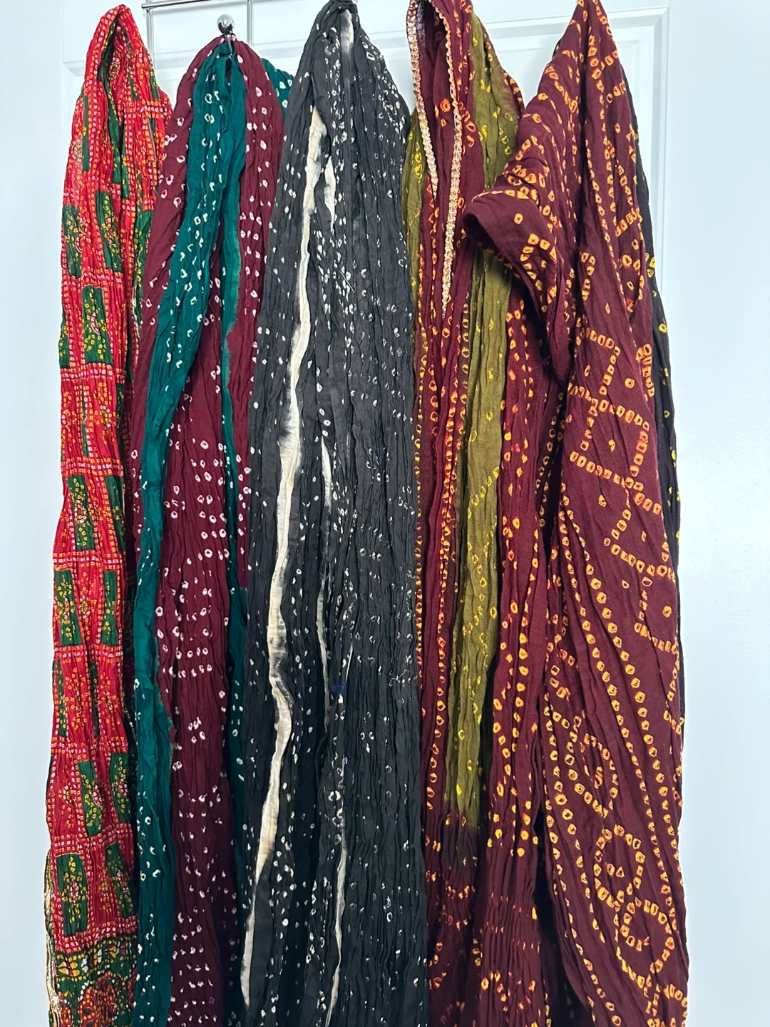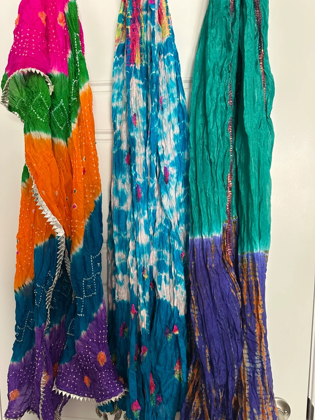 Assortment of vibrant tie-dye duppatas. Great for adding a pop of colour to any outfit! Cotton $8and silk $12 each. Trying to downsize, they are mostly used once or twice. But mostly just sitting in in drawers