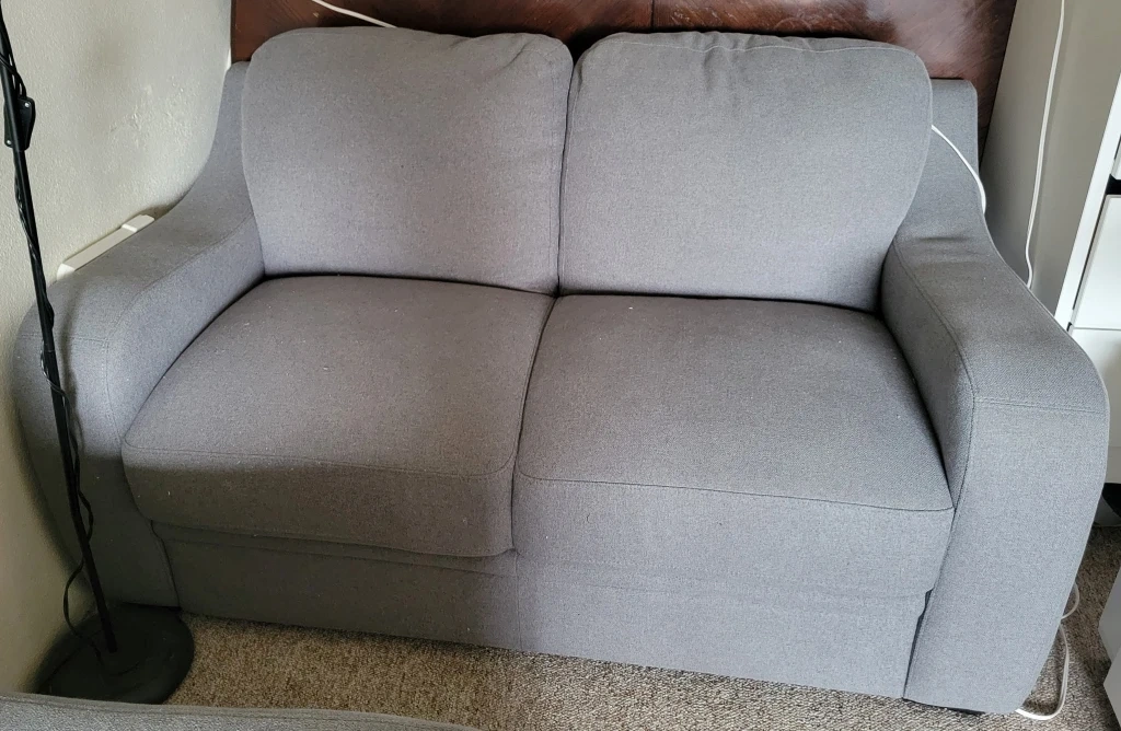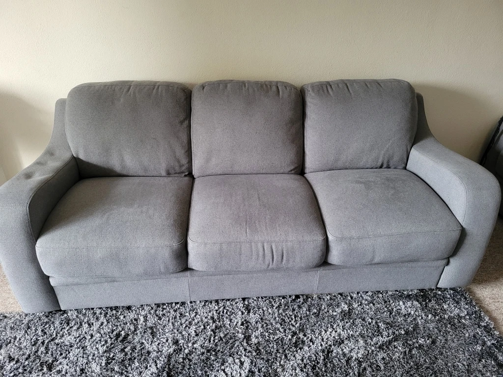Matching loveseat and sofa. Grey fabric upholstery. Clean and in good condition. Comfortable seating. Perfect for apartment or smaller living room.