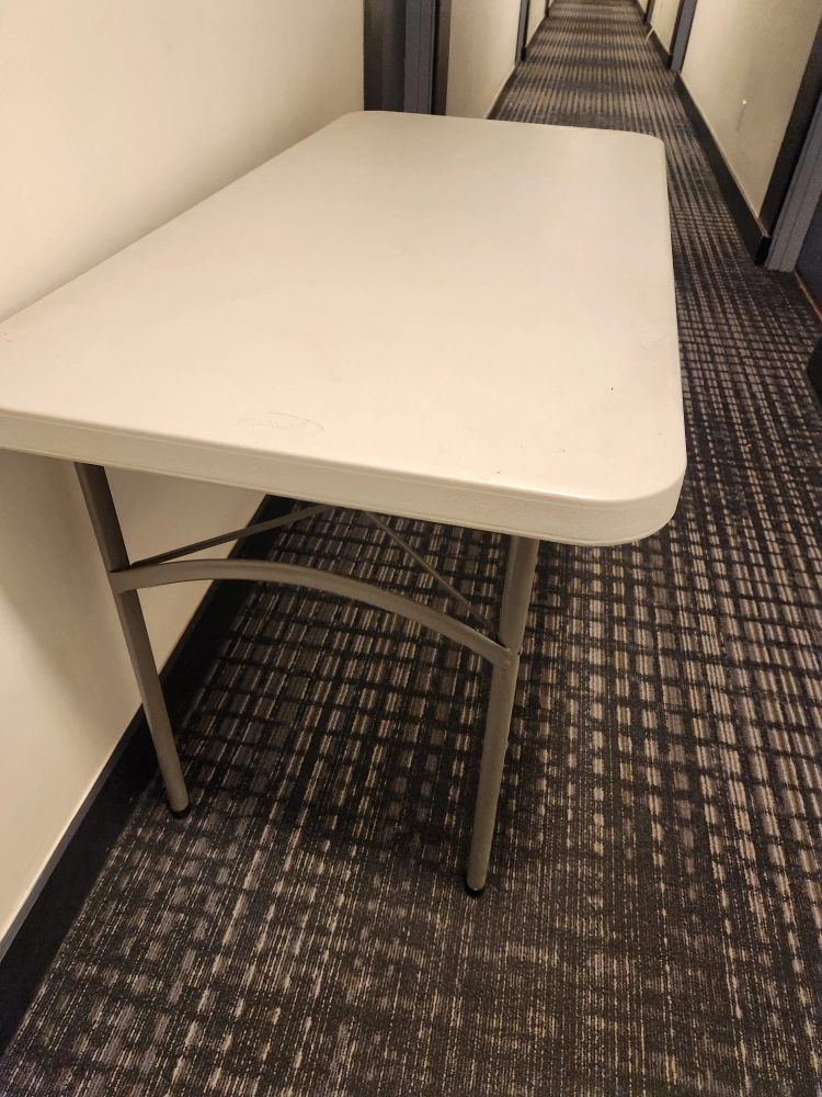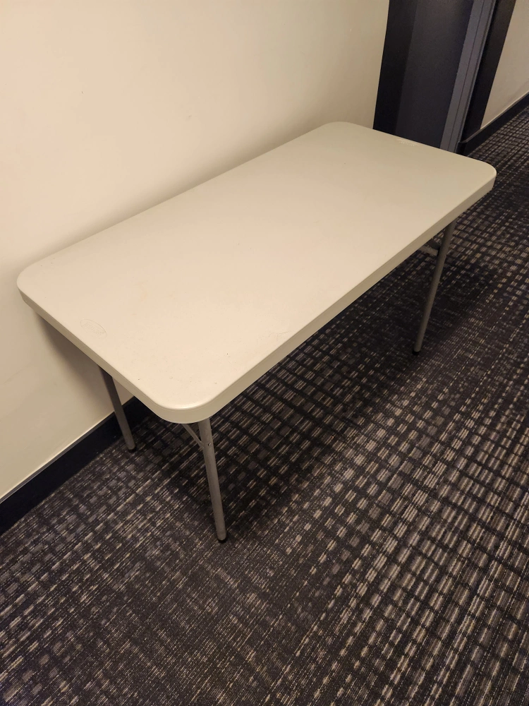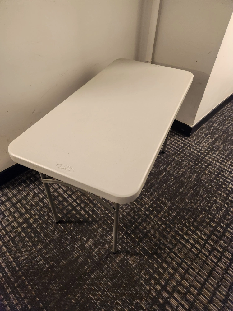 Selling a handy 48inch length folding table from Staples. It's perfect for setting up extra space when you need it, and folds away easily for storage. Great for small gatherings, crafts, or as a temporary workspace! It's in good condition and ready for a new home