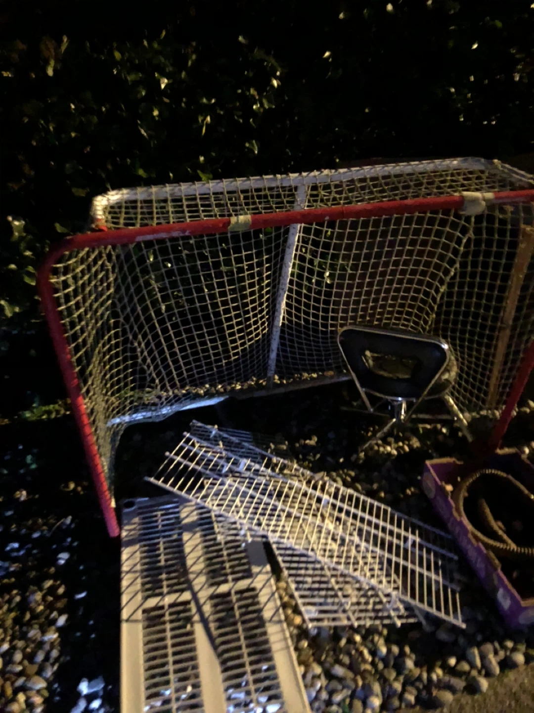 Standard hockey net with red frame and white netting. Includes several white wire shelving units. Great for backyard fun or sports practice!