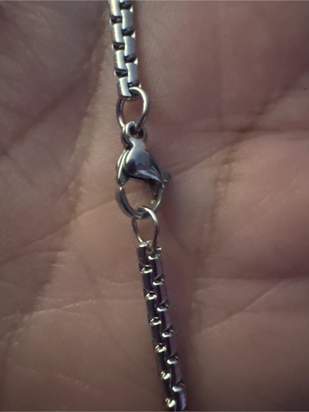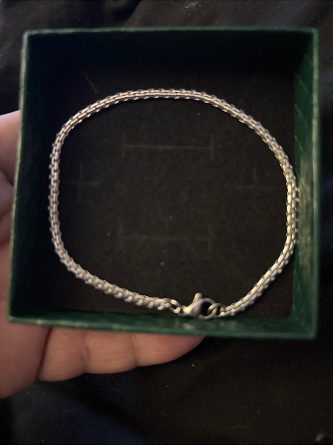 This silver Stainless Steel chain bracelet features a box clasp closure. comes in a small green jewelry box. This simple chain would be a nice everyday accessory. New