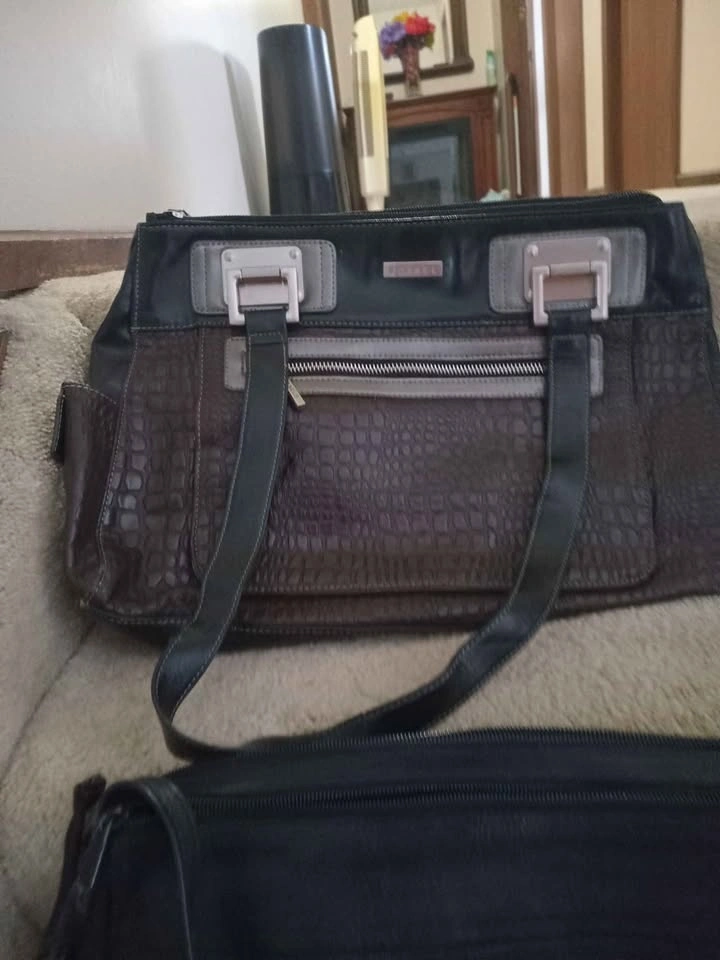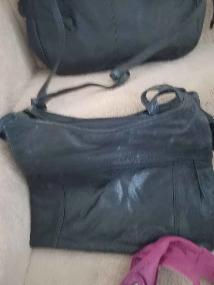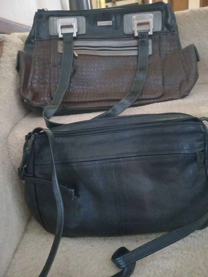 Gently used purses in great condition. Some are new. The teal purse has a cross design, the brown one has a leopard face, the black one has a shiny finish, and the dark brown one has a zippered pocket. All have straps and are made of various materials including leather and suede. Many are Native design. Leather are 35.00 & other designs 45.00