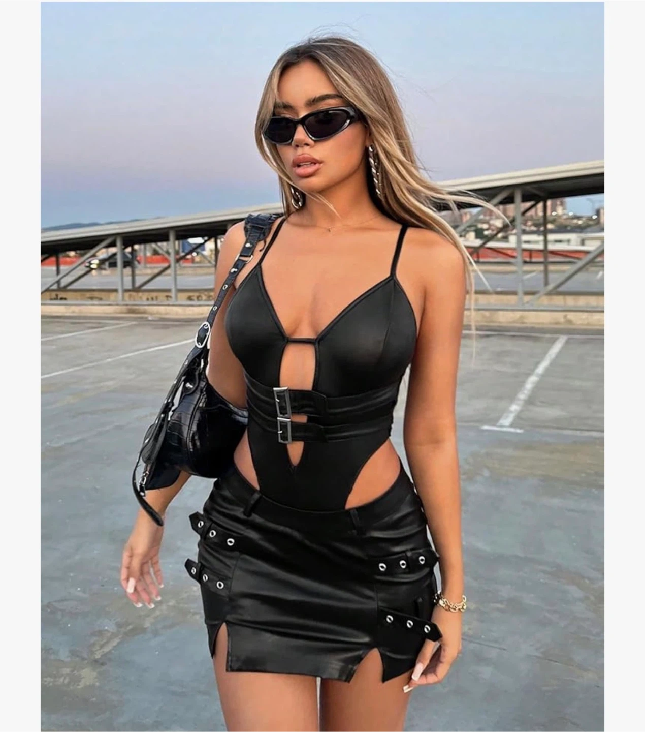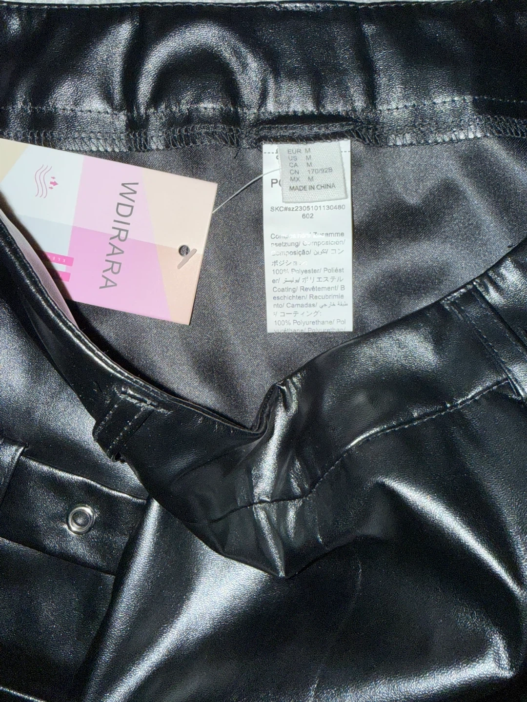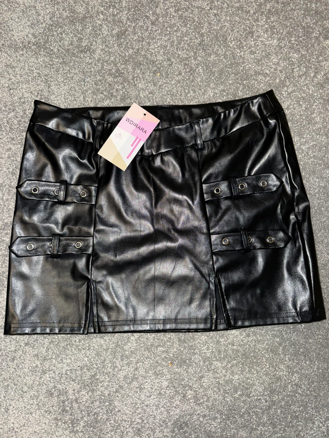 This WDİRARA mini skirt is black and made of faux leather. It's a size medium and features multiple buckle details. The skirt has a split hem design for added style.