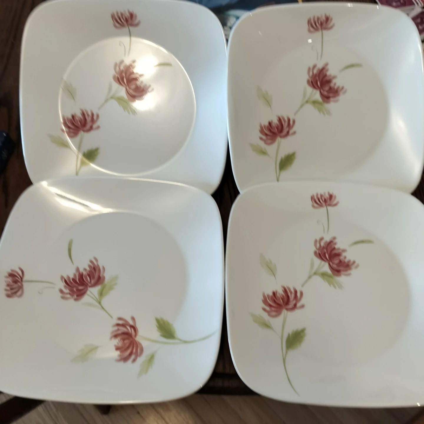 Set of four Corelle square dinner plates. Made with Vitrelle 2 material in the USA. Dishwasher and microwave safe. Suitable for oven use up to broiler.