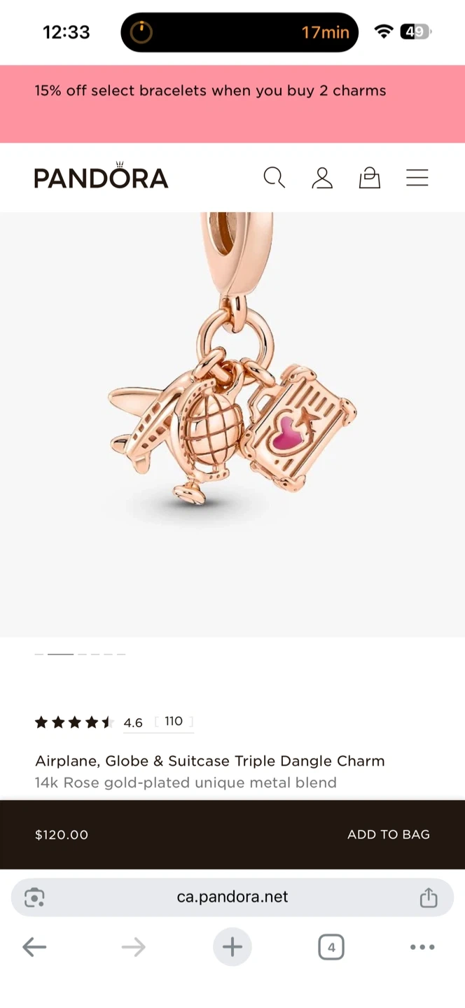 This Pandora charm features an airplane, globe, and suitcase design. This piece is perfect for travellers or anyone who loves adventures!
