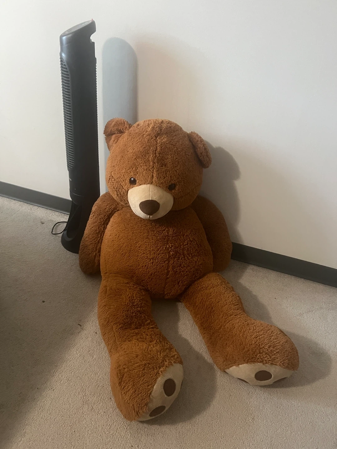 This is a large, soft, brown teddy bear plush toy. It's perfect for snuggles and would make a great addition to any room. Made with plush material.