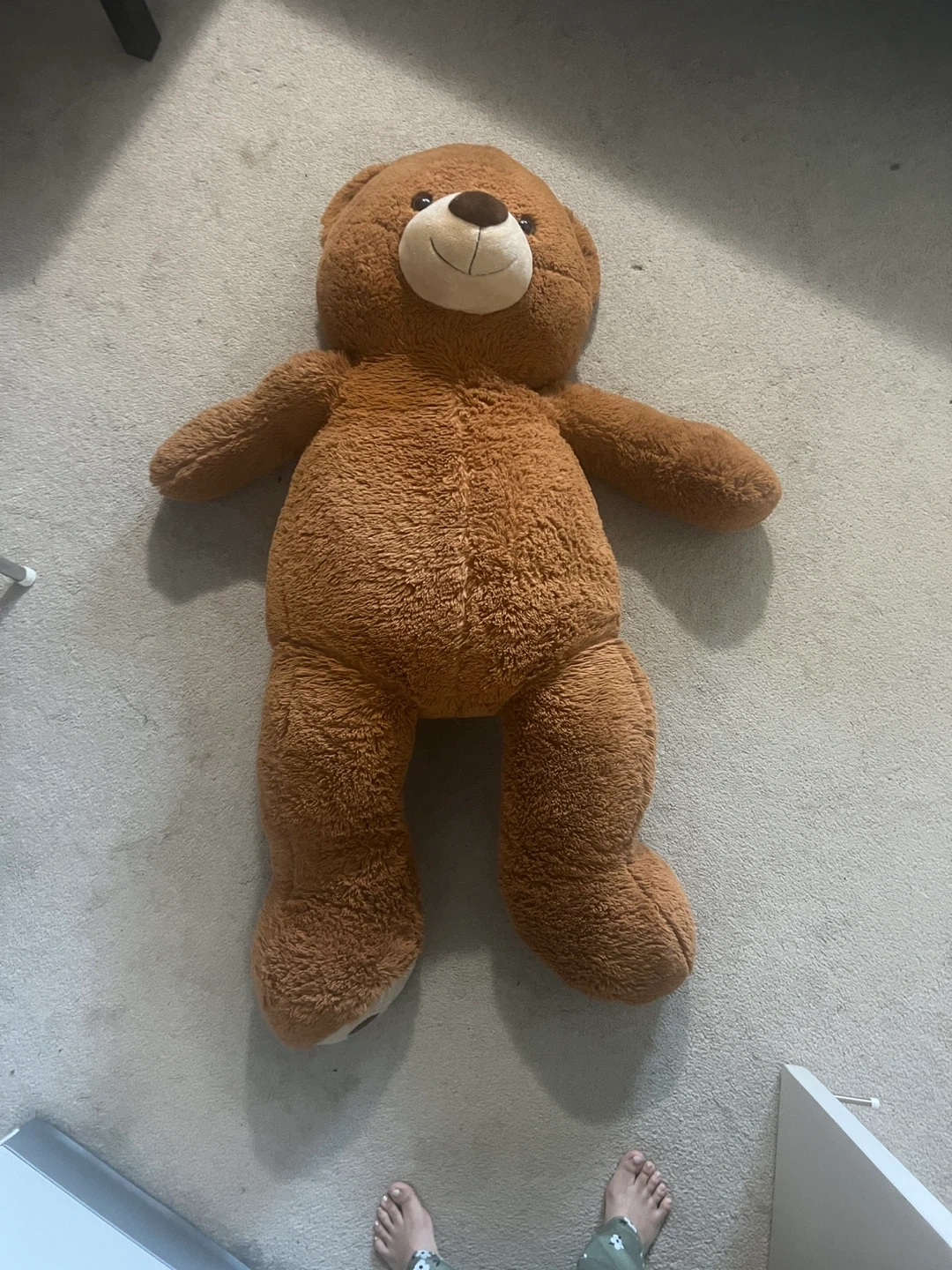 This is a large, soft, brown teddy bear plush toy. It's perfect for snuggles and would make a great addition to any room. Made with plush material.