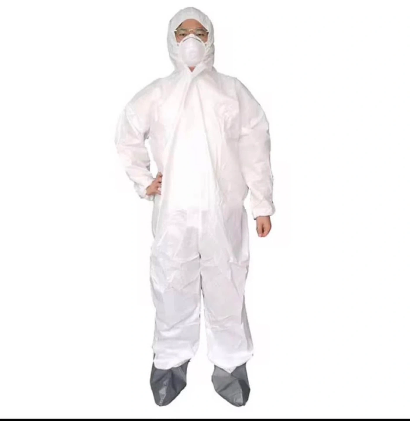 Disposable white coveralls in size 3XL. Each set includes a hood and boot covers. These are lightweight and designed for protection.