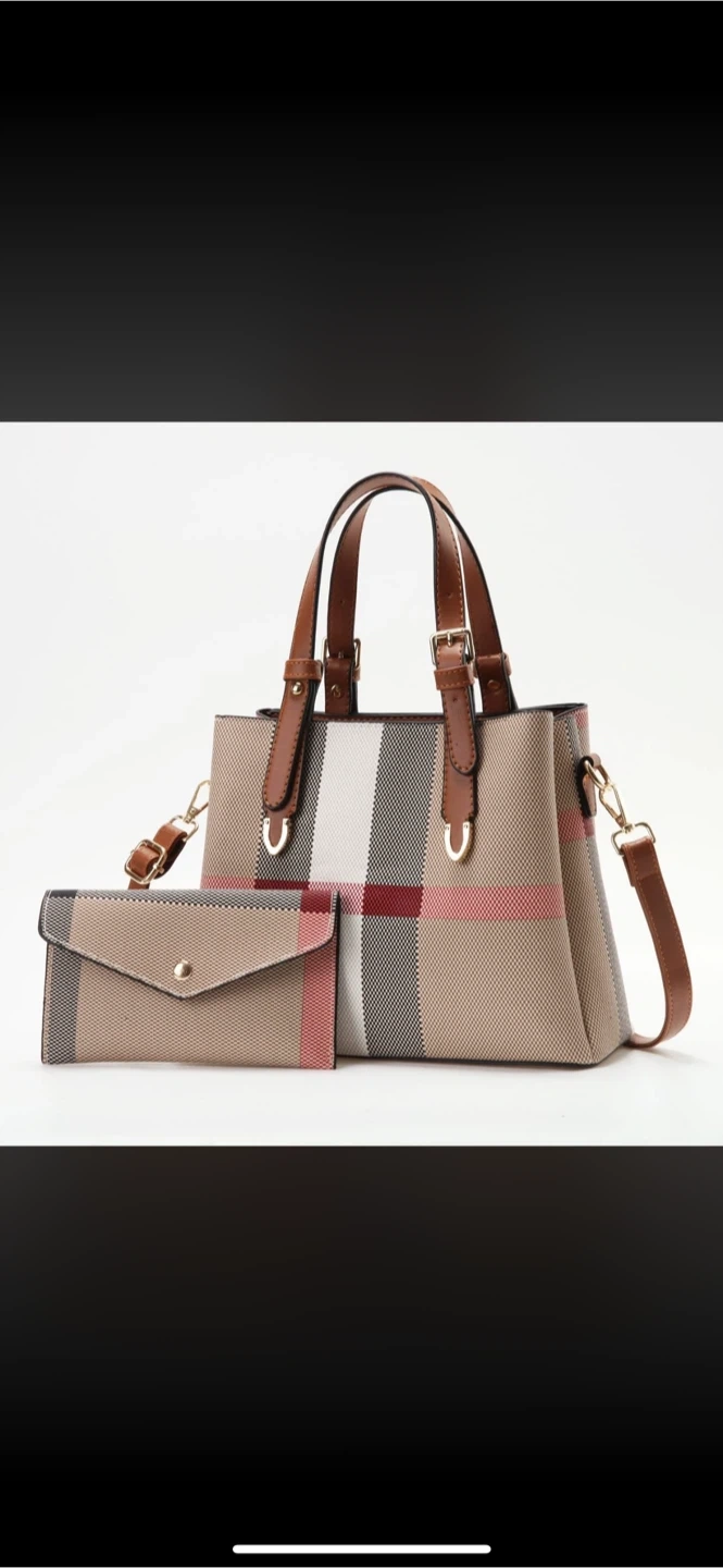 Stylish plaid handbag with a matching wallet included! The bag features brown handles and gold-tone hardware. Perfect for everyday use!