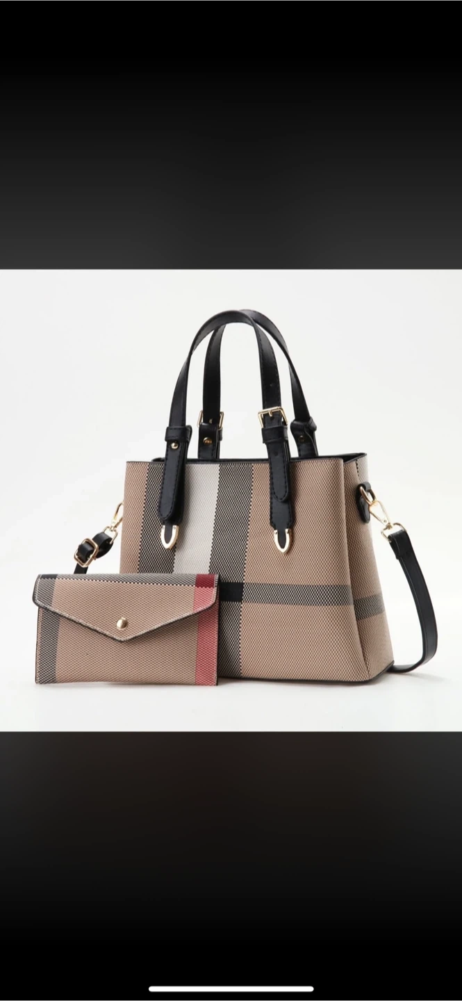 Stylish plaid handbag with a matching wallet included! The bag features brown handles and gold-tone hardware. Perfect for everyday use!