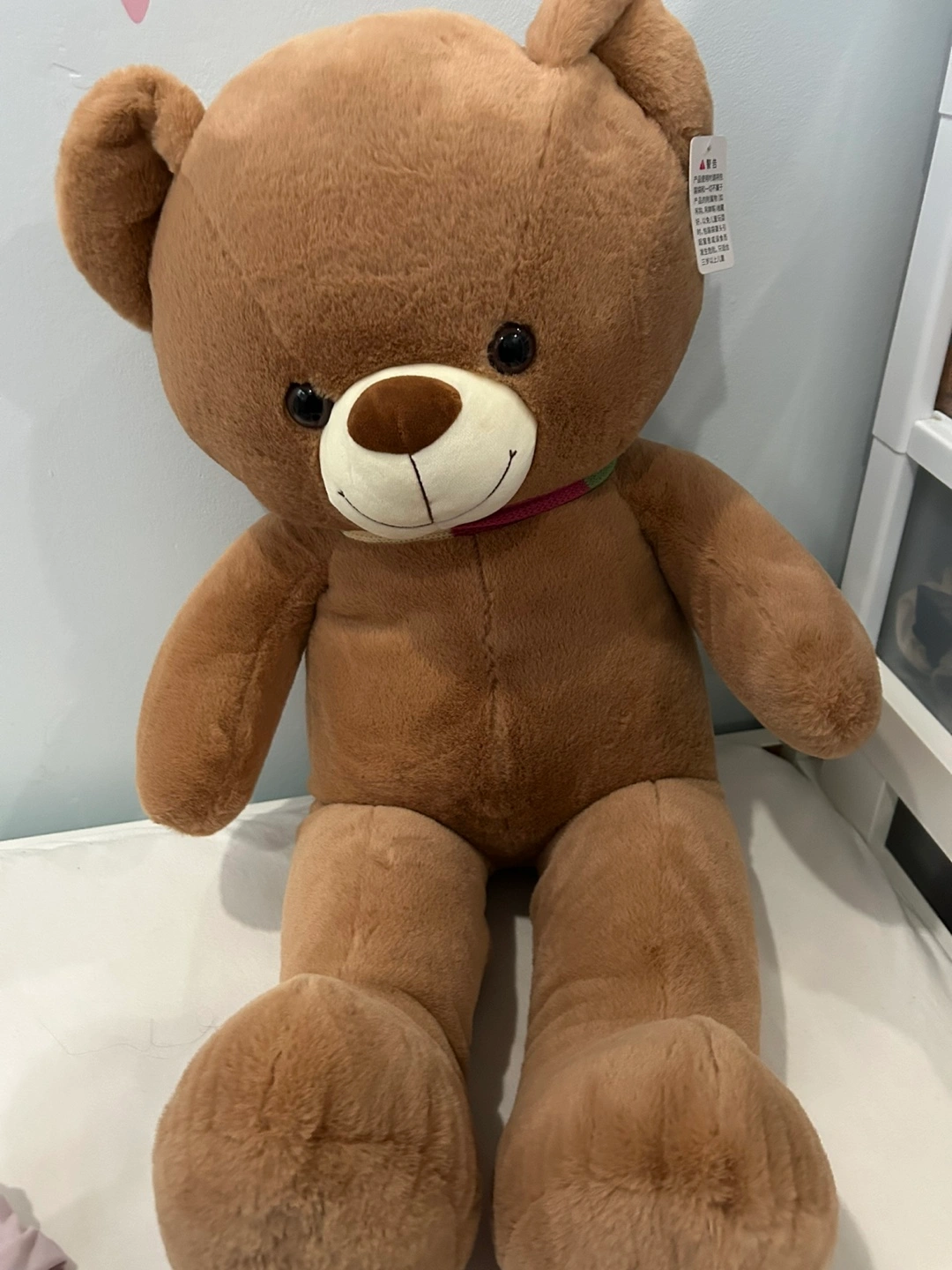 Giant cuddly brown teddy bear. Soft plush material. Perfect for cuddling or decorating.
