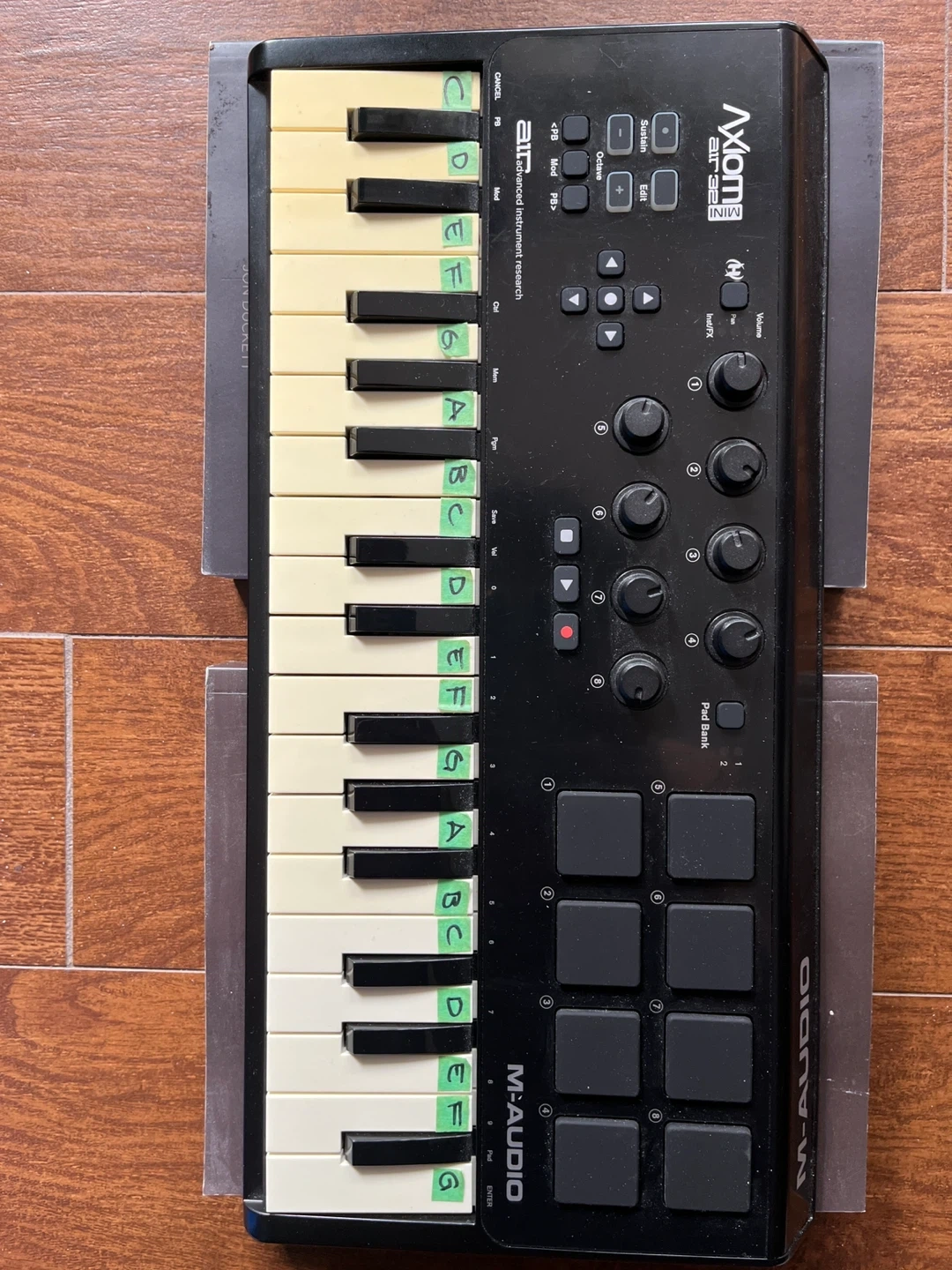 This is an M-Audio Axiom Air 32 mini MIDI keyboard controller. It features 32 velocity-sensitive keys and eight assignable pads. This controller is powered via USB and includes transport controls and assignable knobs for DAW integration.
