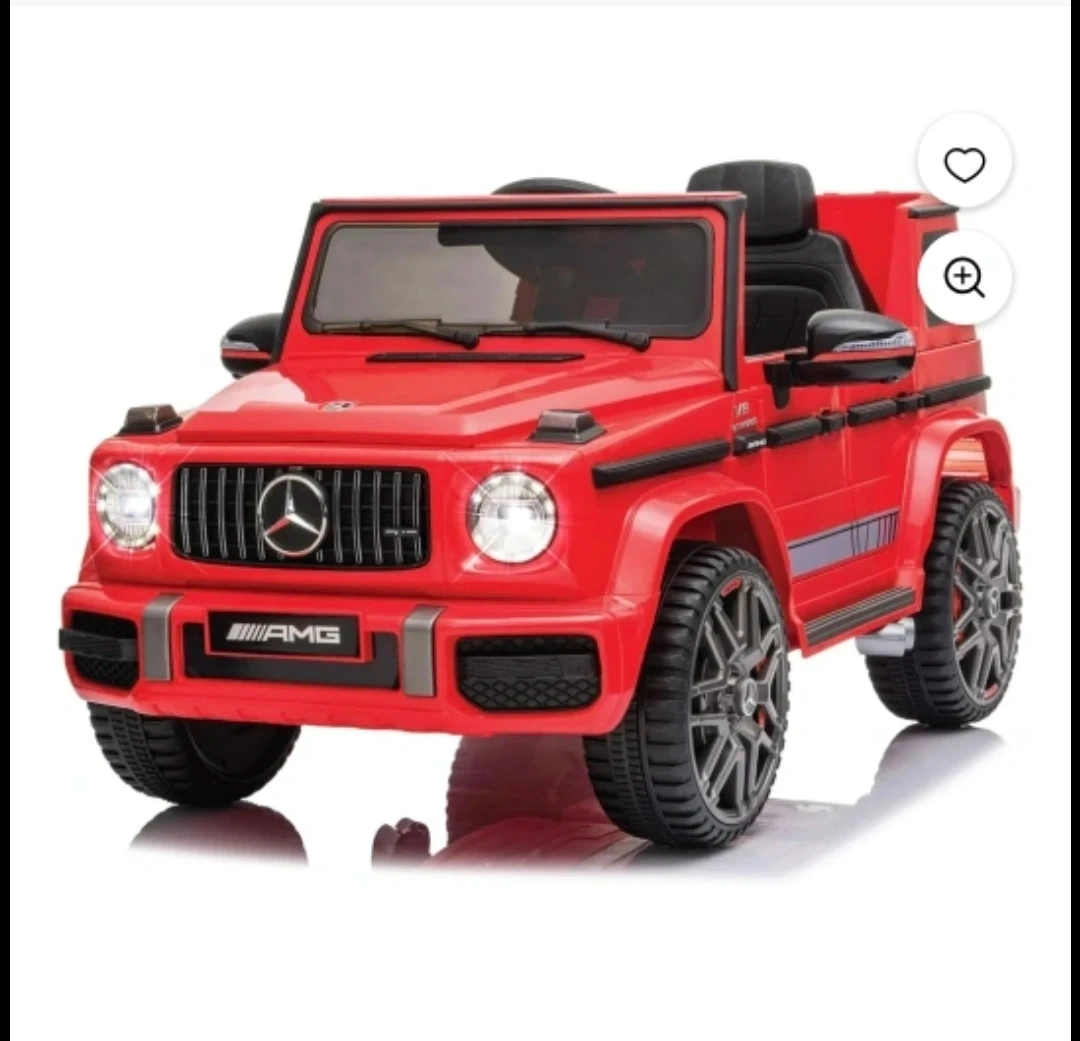 This is a fun red ride-on toy car designed to look like a Mercedes-Benz G-Wagon. It features realistic details like working lights and a sporty AMG trim. It's perfect for kids who love cars!