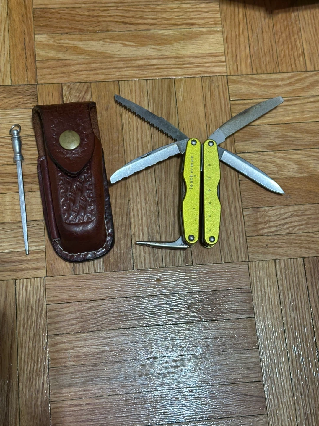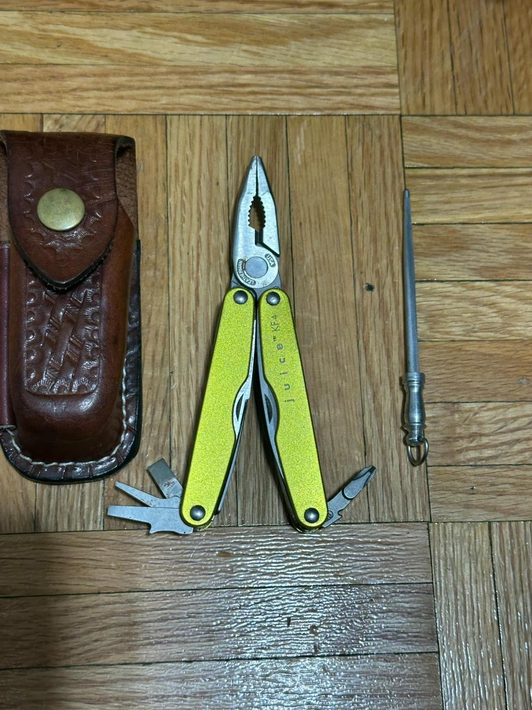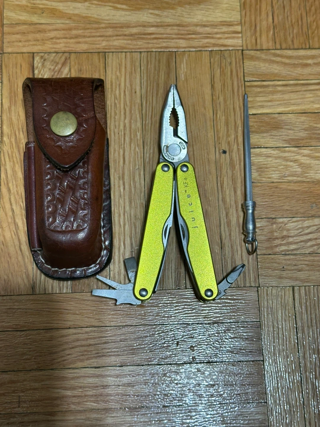 This Leatherman Juice CS4 multi-tool comes in a bright yellow colour. It includes the multi-tool and a brown leather sheath. The multi-tool has pliers, a knife blade, a wood saw, and other small tools. It's compact and great for everyday carry!