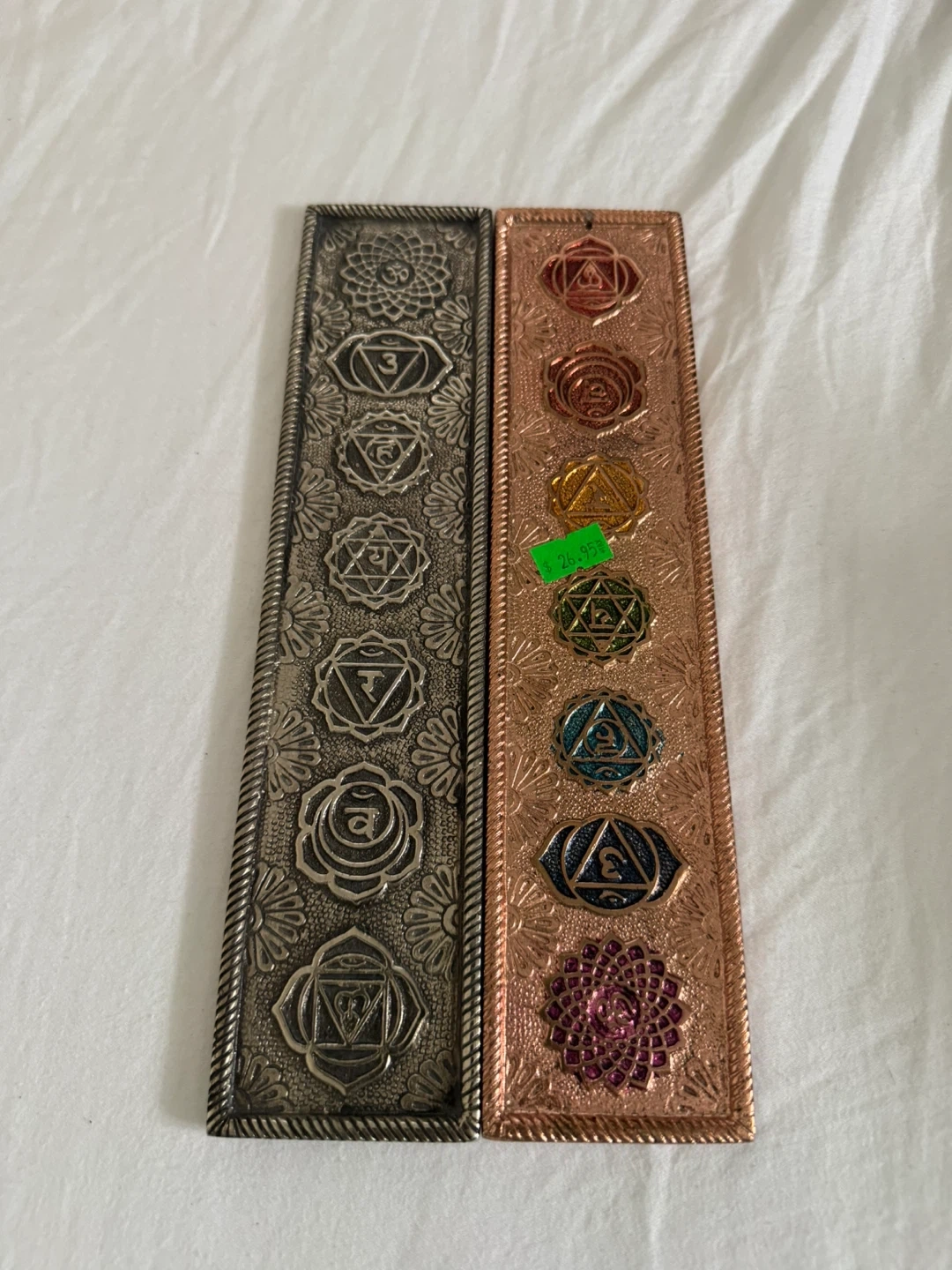 Two decorative incense holders, one in silver and one in copper tone, featuring detailed chakra symbols. They're great for holding incense sticks and adding a touch of spiritual decor. They look nice on a shelf or table.