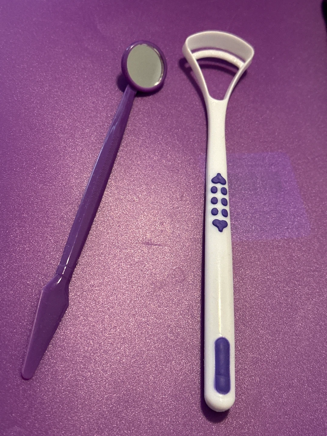 This set includes a white plastic tongue scraper and a purple dental mirror. The scraper has a textured grip and a curved edge for effective cleaning. The mirror is for checking oral hygiene.