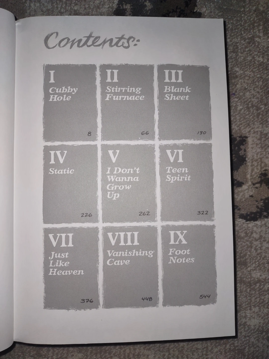 This is "Blankets," an illustrated novel by Craig Thompson. It's a graphic novel exploring themes of young love and growing up. The book contains nine distinct sections with page numbers indicated.