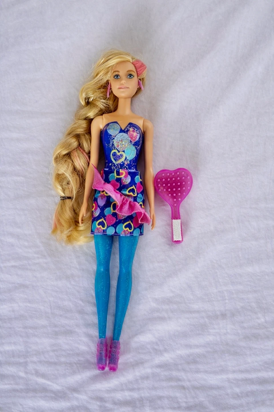 This is a Barbie doll featuring long blonde hair with pink streaks. She's wearing a sparkly blue dress with hearts and balloons. It comes with a pink heart-shaped brush accessory. Great for playtime!