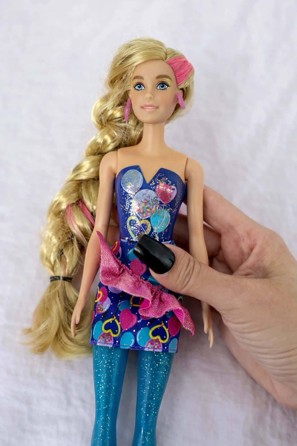 This is a Barbie doll featuring long blonde hair with pink streaks. She's wearing a sparkly blue dress with hearts and balloons. It comes with a pink heart-shaped brush accessory. Great for playtime!