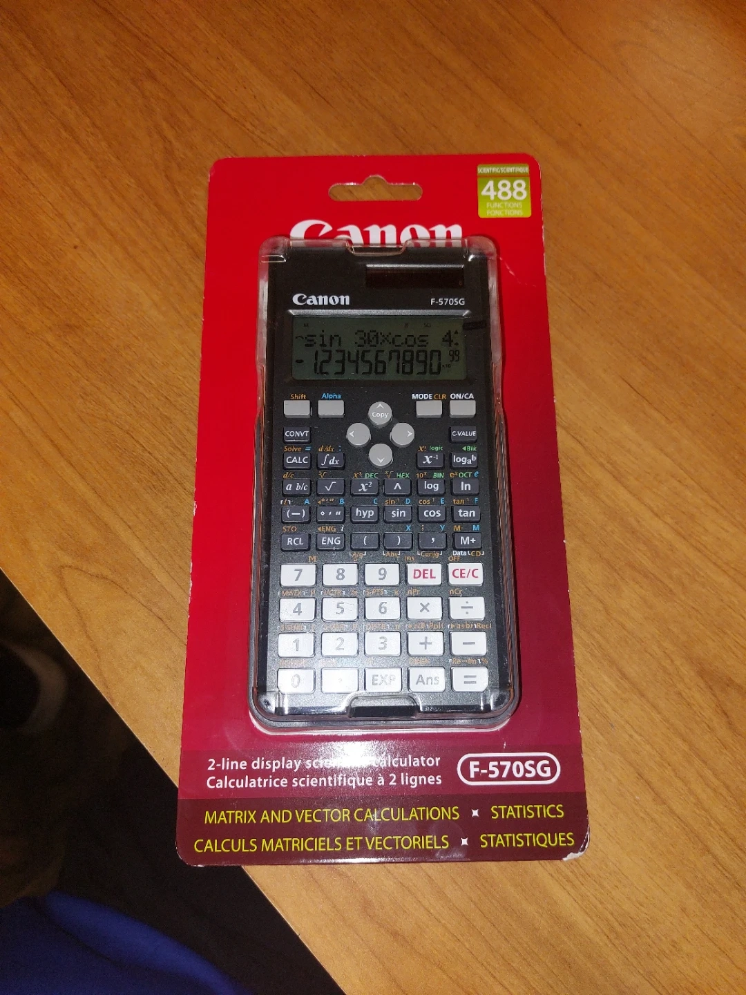 Canon F-570SG 2-line display scientific calculator. It has 488 functions, including matrix and vector calculations, and statistics. It's ideal for students needing advanced mathematical functions.