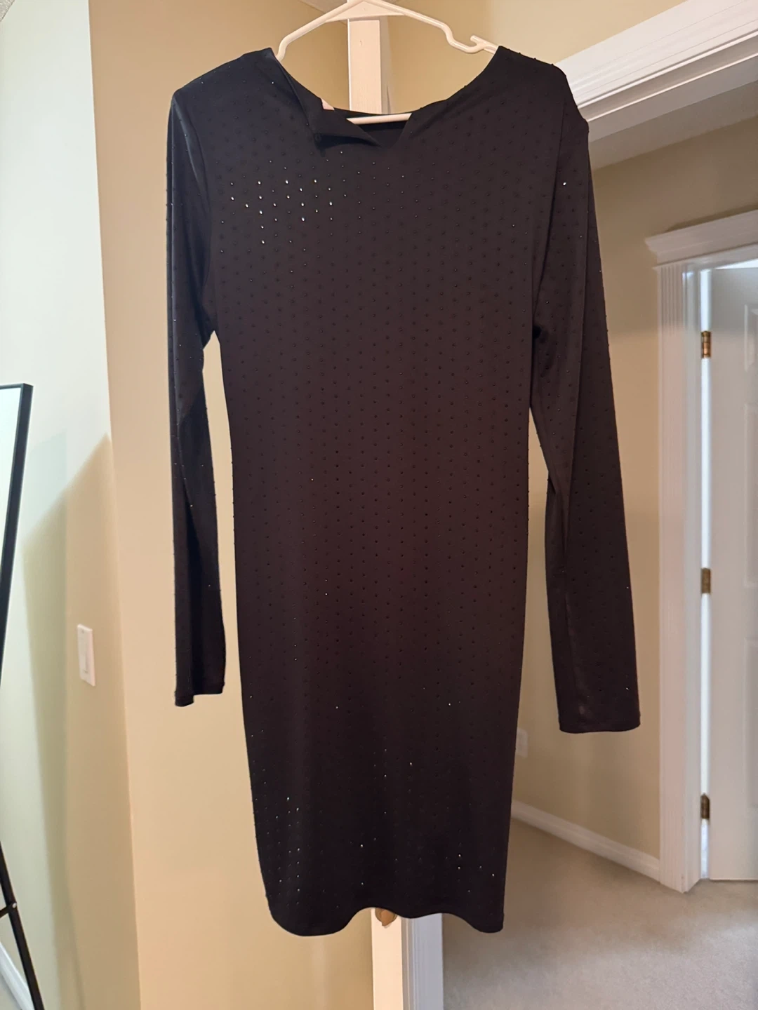 Selling a cute black long sleeve dress! It has a stylish twist detail in the front. Perfect for a night out or a special occasion. It's in great condition and ready for a new home!