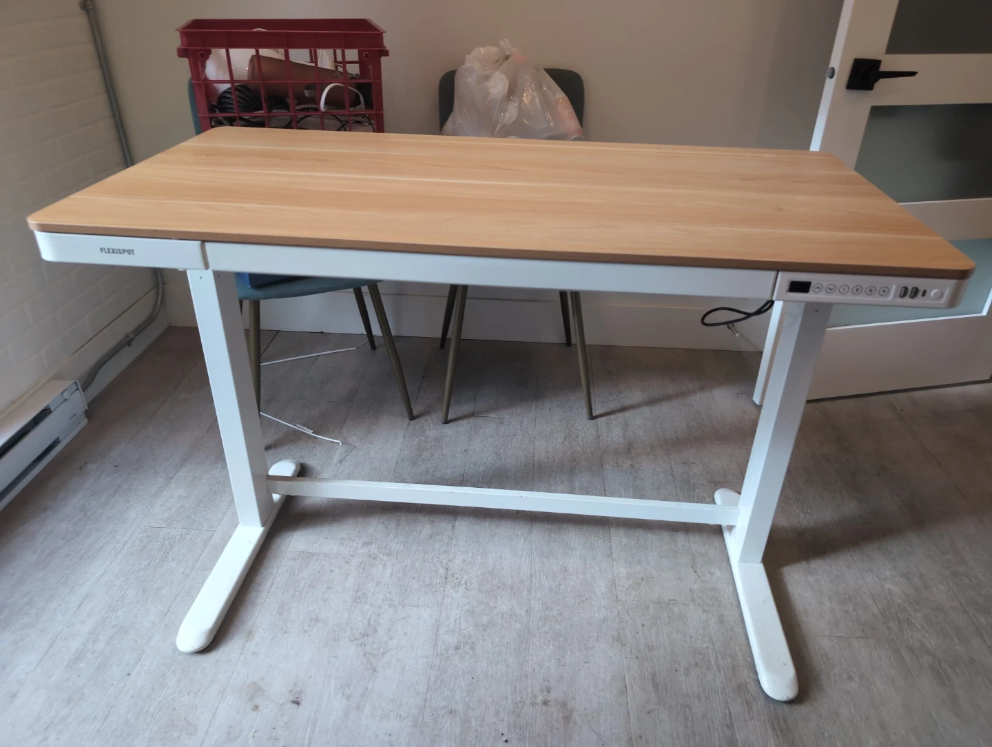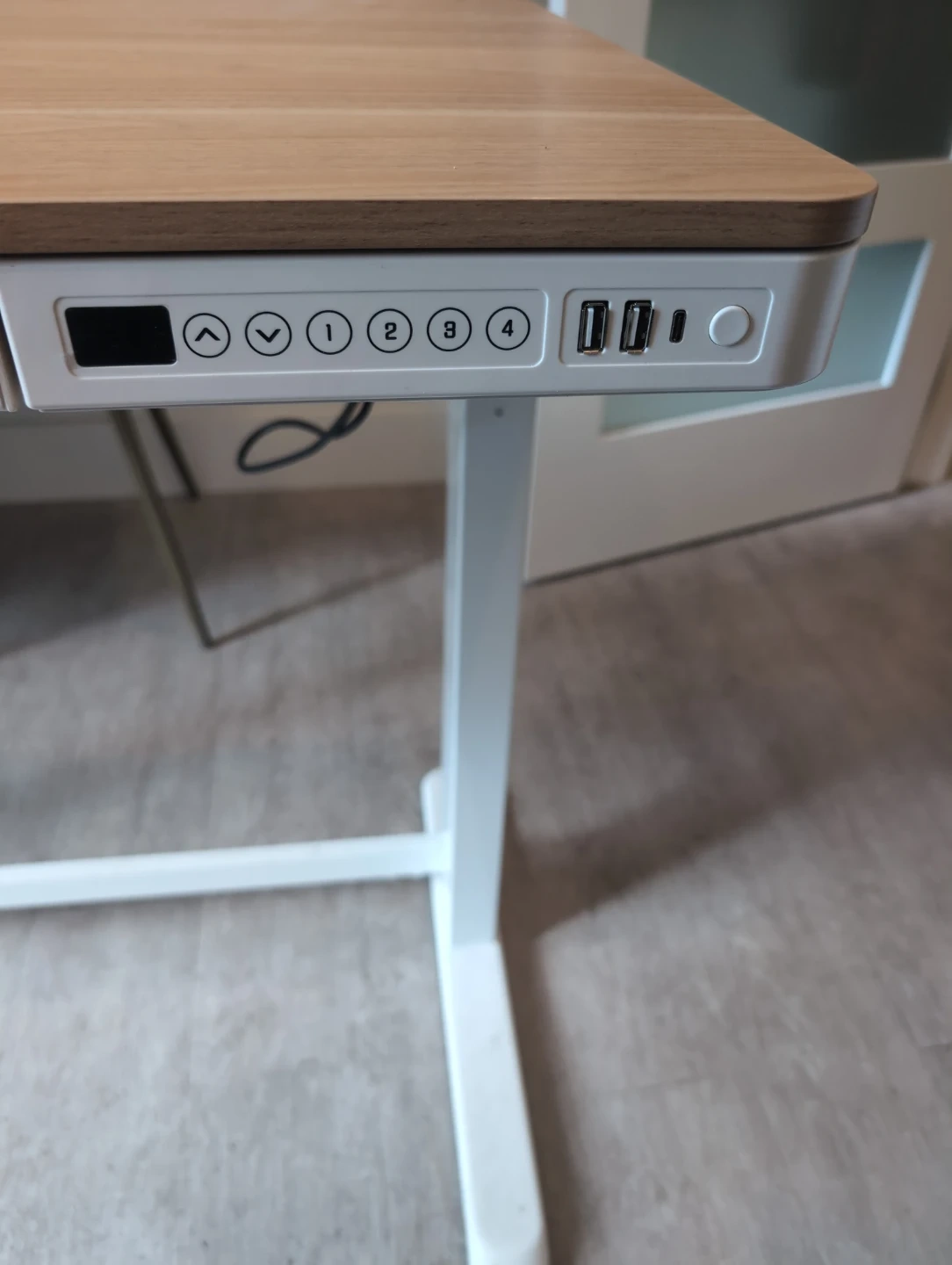 This is a FlexiSpot standing desk with a nice wooden top and white frame. It's an electric adjustable height desk with memory presets and USB charging ports. Works great for home office setups!