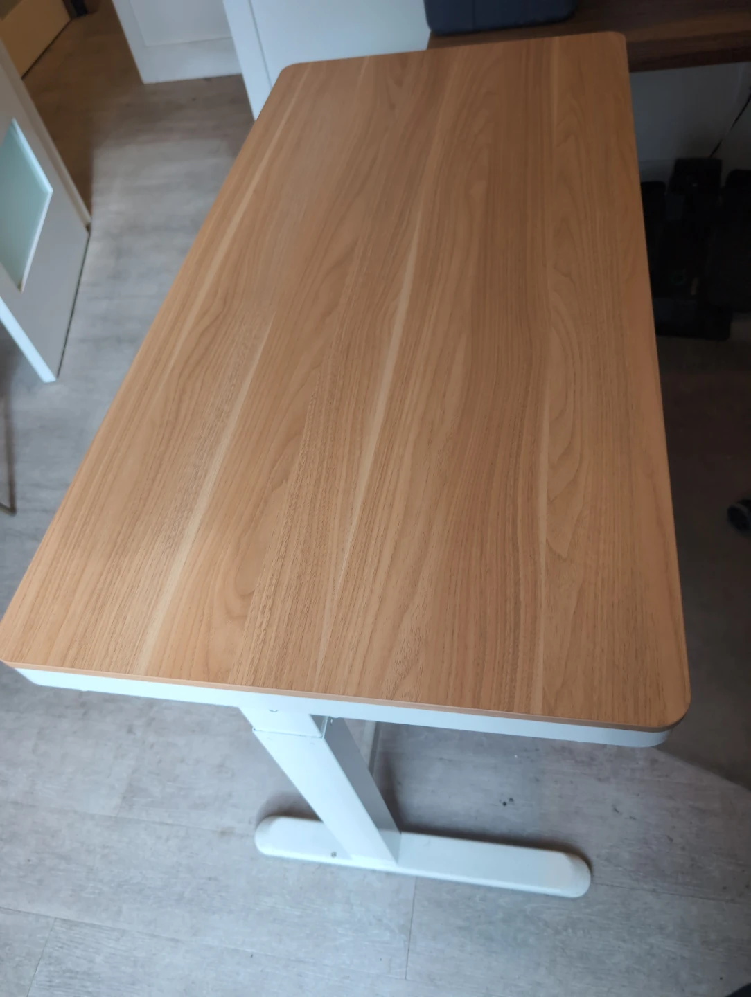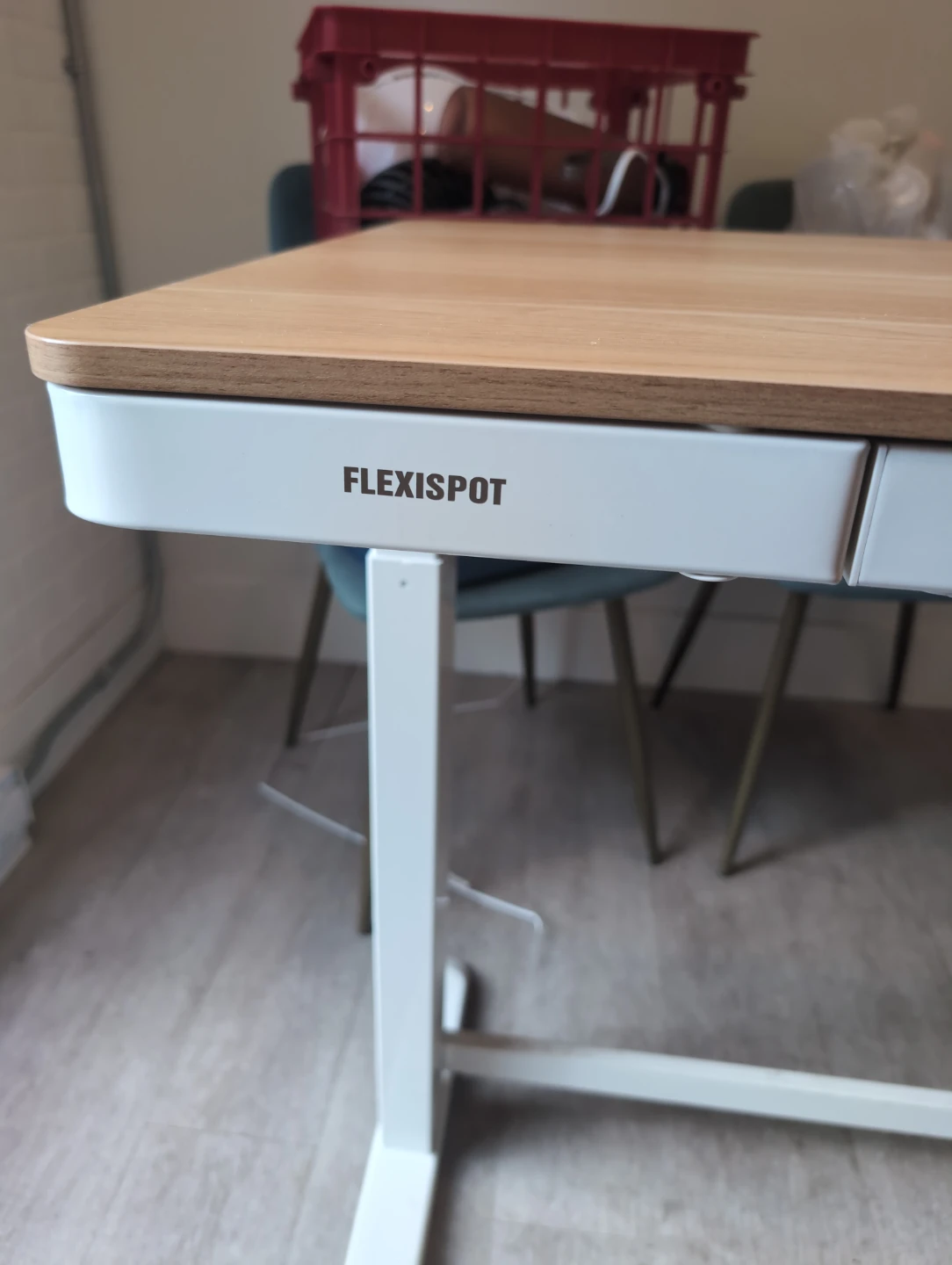 This is a FlexiSpot standing desk with a nice wooden top and white frame. It's an electric adjustable height desk with memory presets and USB charging ports. Works great for home office setups!