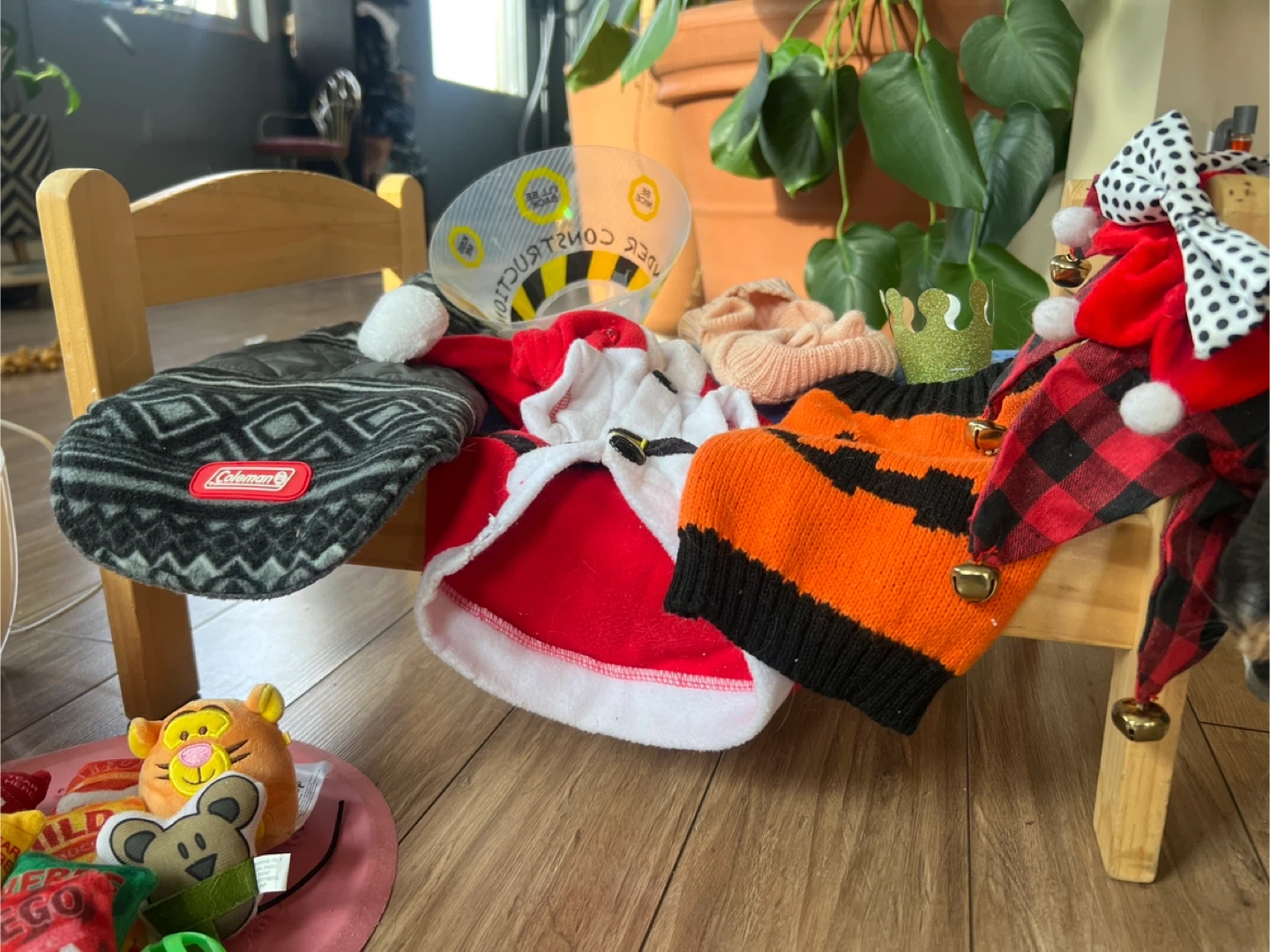 This bundle includes various pet sweaters and accessories. There are also cat toys, a food bowl, and a protective cone. Bedframe, catit water fountain (new motor needed)