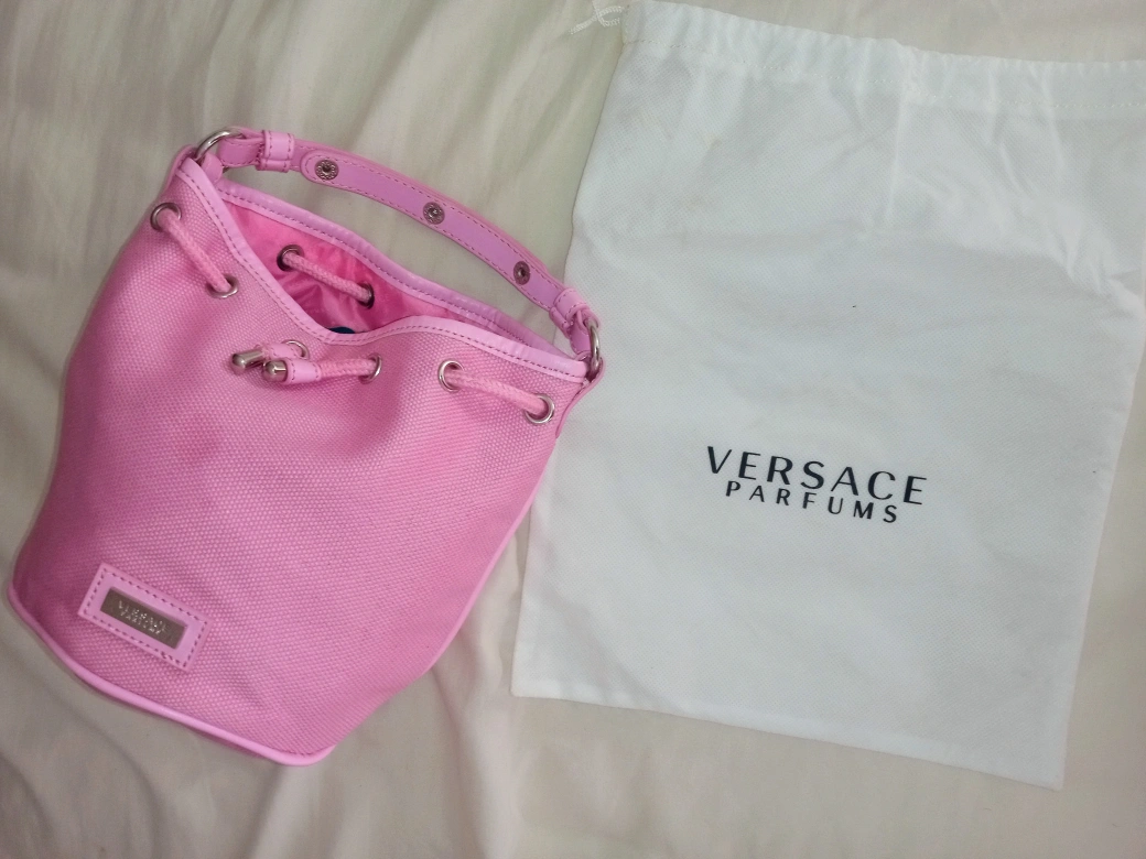 VERSACE PARFUMS drawstring purse, bucket/bag. Poly/cotton blend, studs (hardware). Comes with dust bag. Never used. CASH ONLY! We don't carry change or travel. MeetUp between 7-7. 2600 East Broadway Vancouver Technical School.