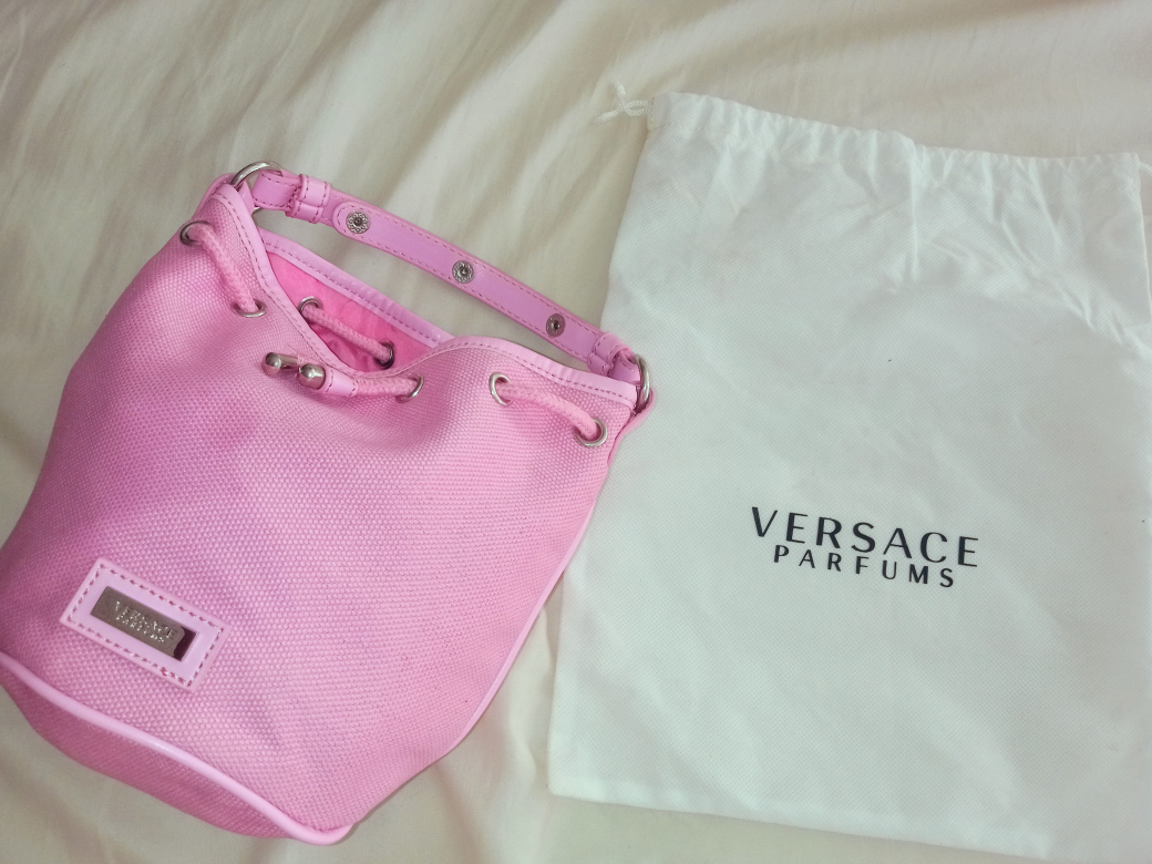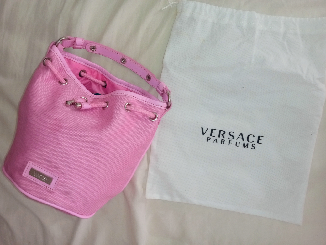 VERSACE PARFUMS drawstring purse, bucket/bag. Poly/cotton blend, studs (hardware). Comes with dust bag. Never used. CASH ONLY! We don't carry change or travel. MeetUp between 7-7. 2600 East Broadway Vancouver Technical School.