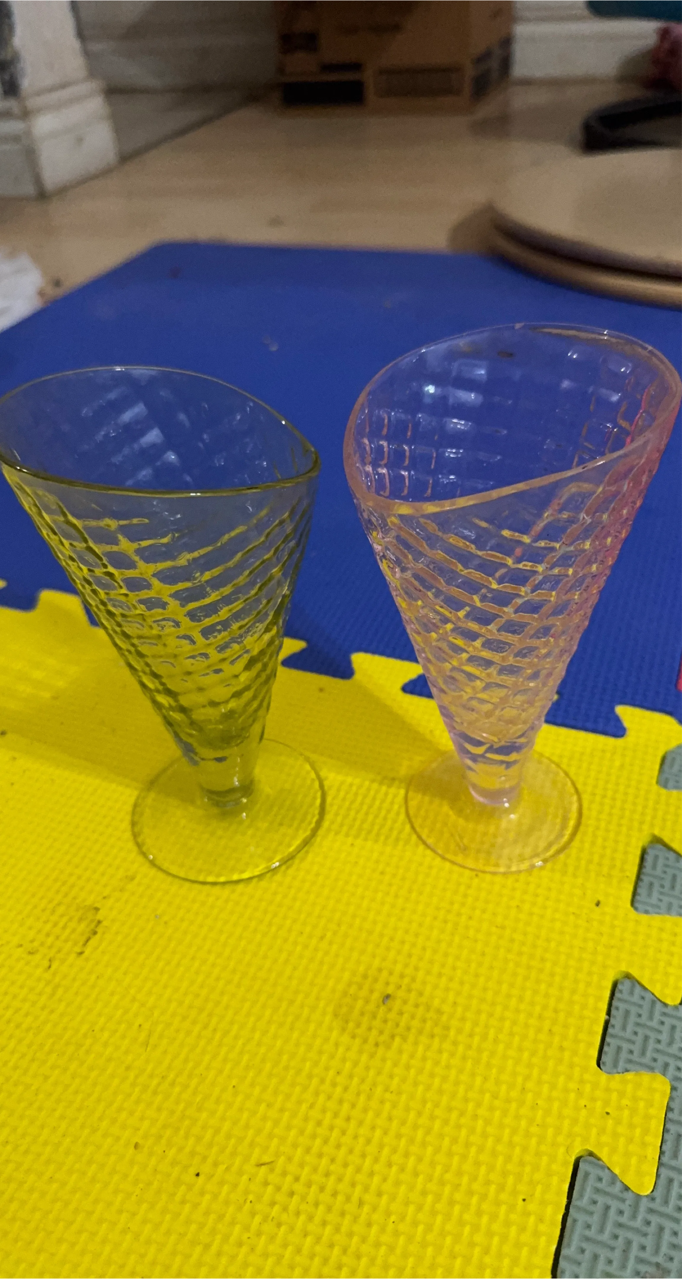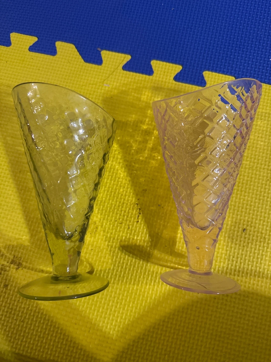 Two dessert glasses shaped like ice cream cones. One is clear yellow, and the other is a light pinkish-purple colour. Perfect for enjoying ice cream sundaes or other treats!