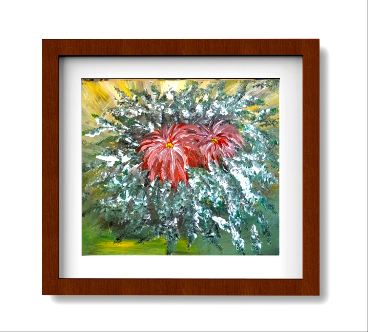 This is an original acrylic painting depicting two vibrant red flowers amongst lush green foliage, with accents of white. It's rendered in a thick impasto style. The artwork is painted on a wood slab and unframed. It's a beautiful piece to add to home's decor or give as a gift.