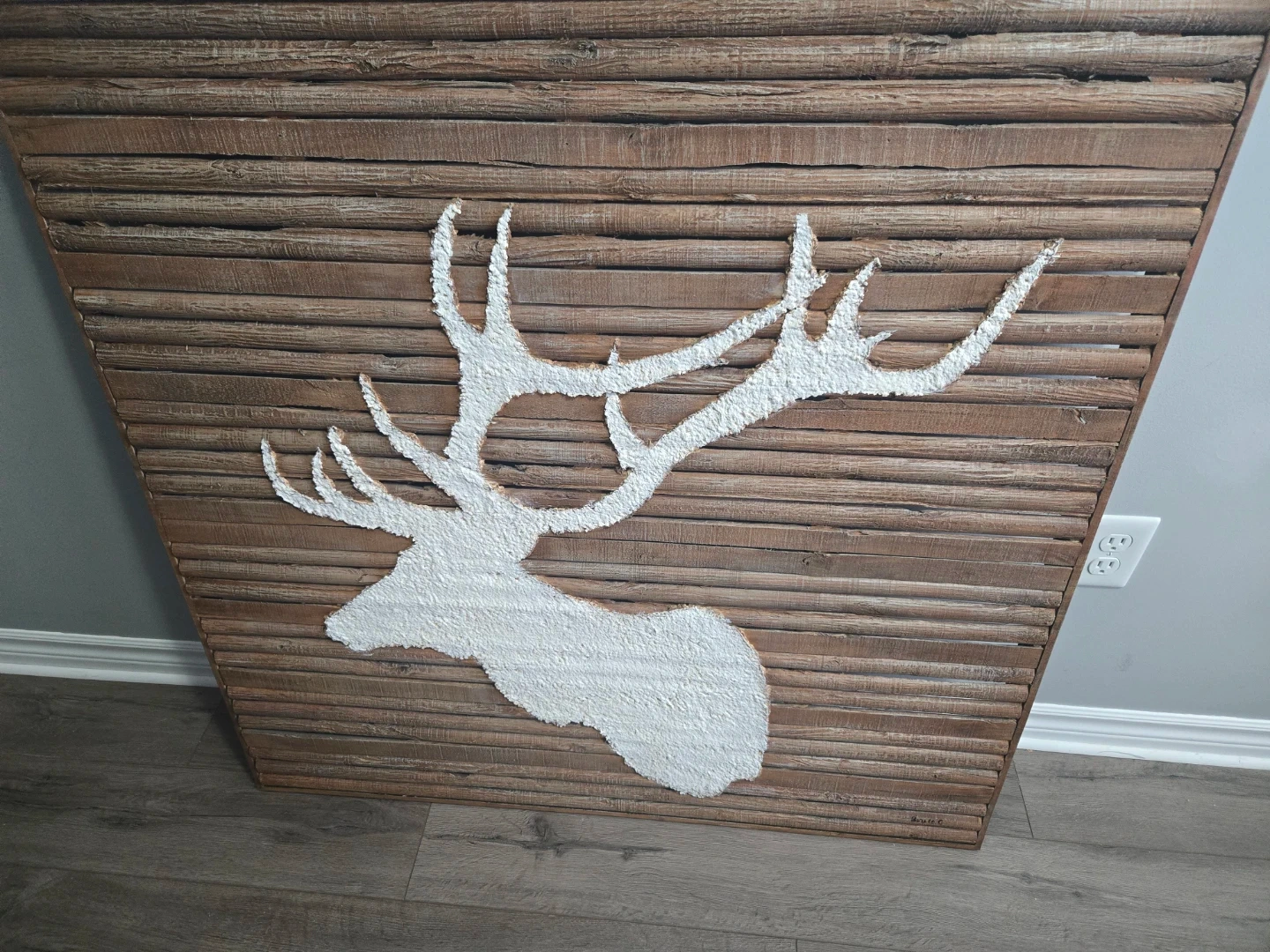 Rustic wood wall art featuring an elk design. It measures approximately 40 inches in length. Perfect for adding a touch of cabin charm to your home!