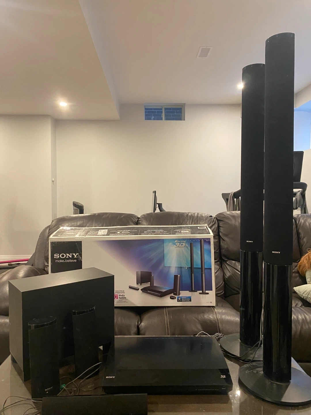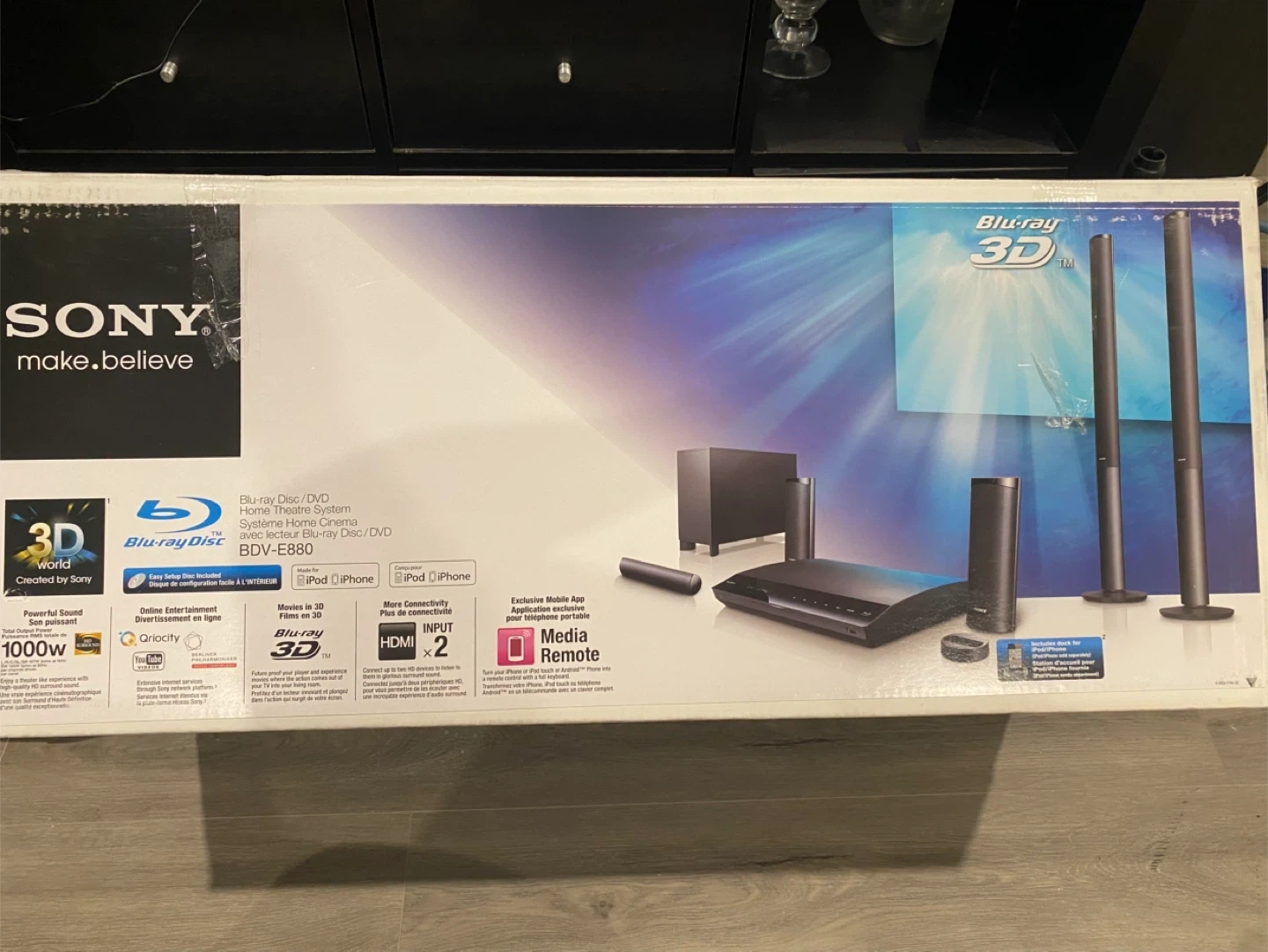 Sony Blu-Ray 3D Home Theatre System. Includes Blu-Ray Disc/DVD player, subwoofer, two tall speakers, two small speakers, and a soundbar. Has 1000W of power. Comes with the original box. Connects via HDMI.