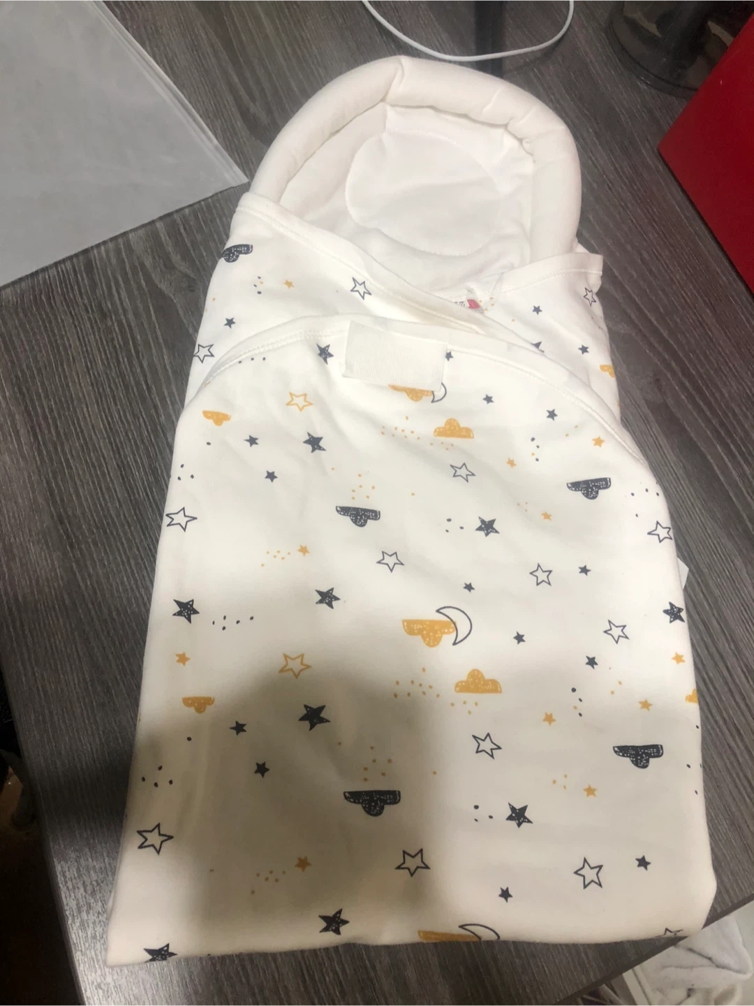 I'm selling a new AJULA newborn blanket in great condition! It's white with a cute star pattern. The blanket is designed with a U-shaped ring and a designated head zone for extra comfort and support for your little one!