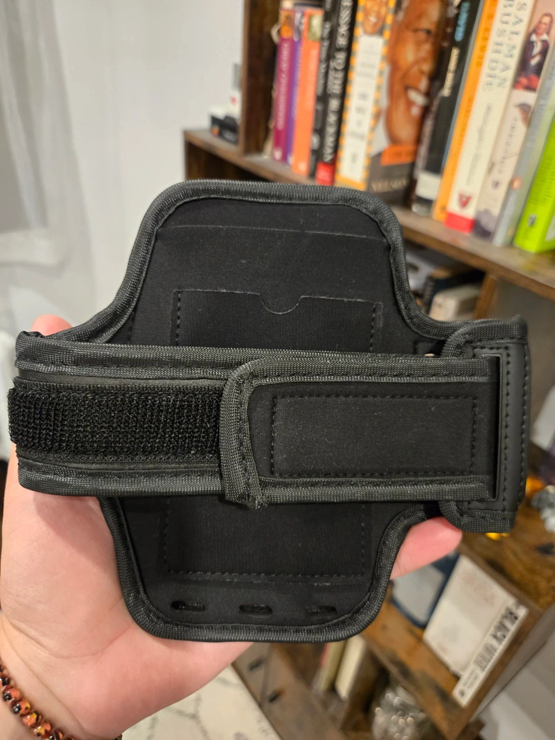 This is a 12 Gear black armband designed for carrying your phone & payment cards while you're active. It's made from neoprene material and features an adjustable strap for a secure fit. It's great for runners or anyone who needs to keep their phone accessible during workouts!