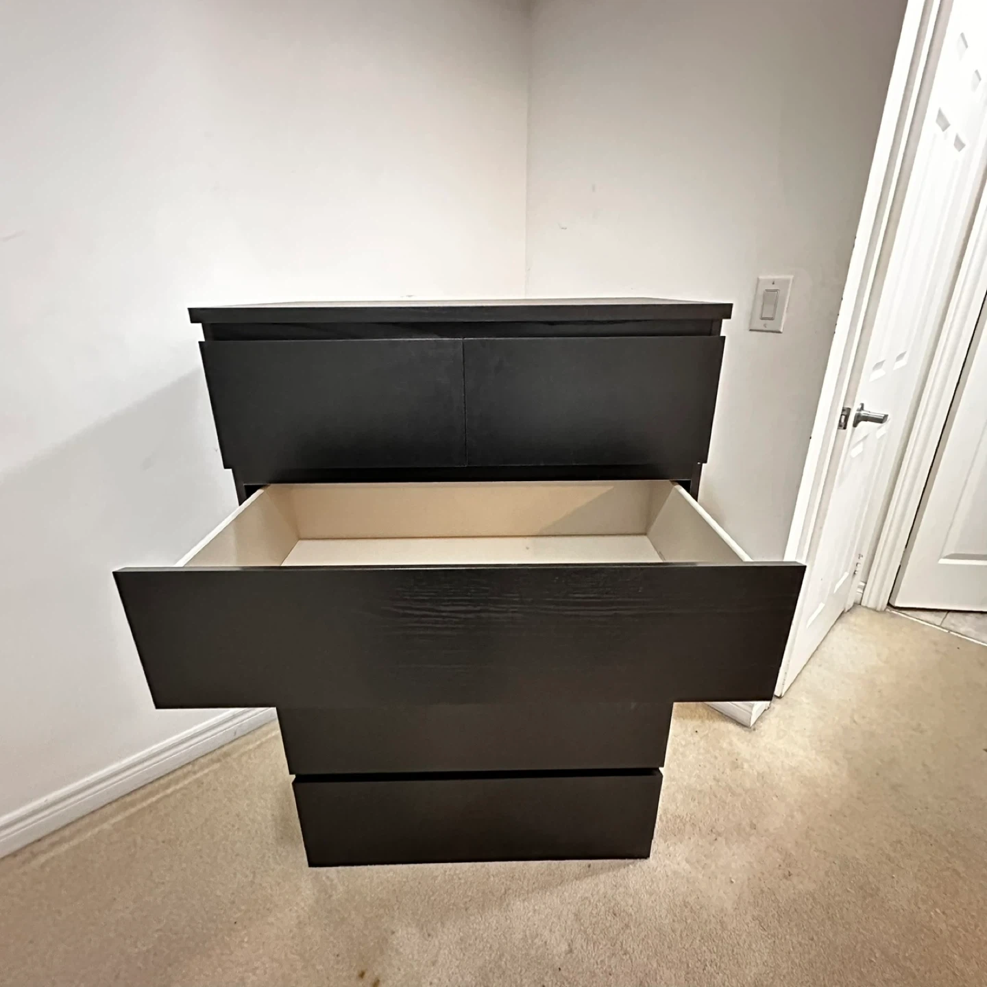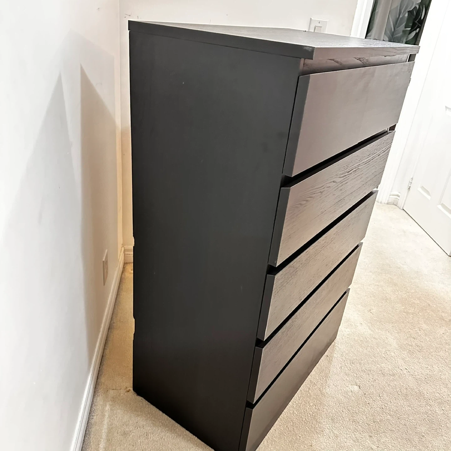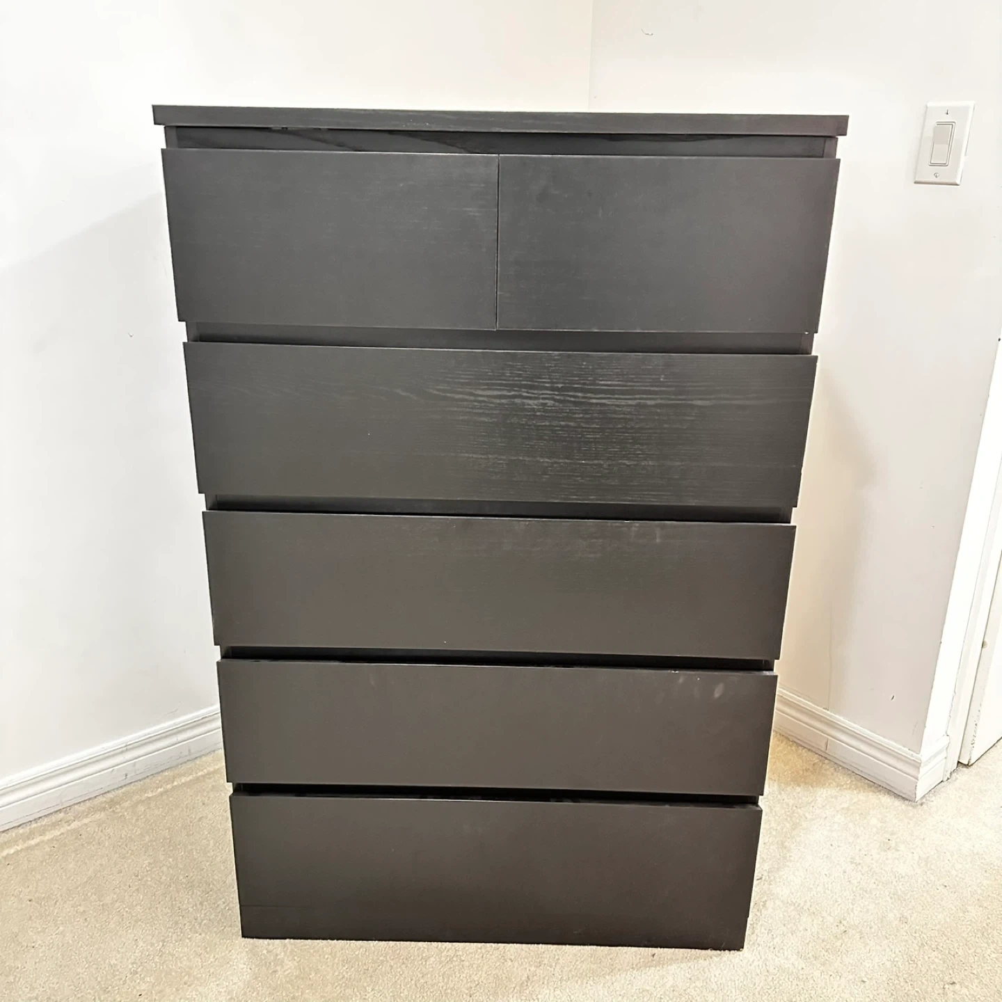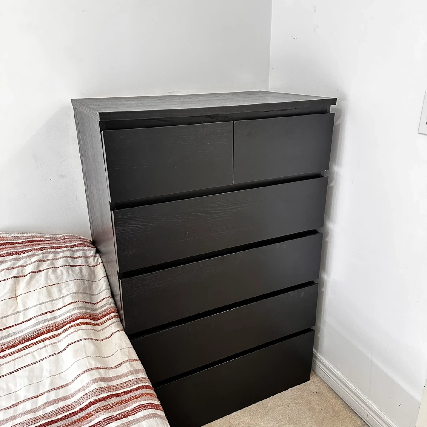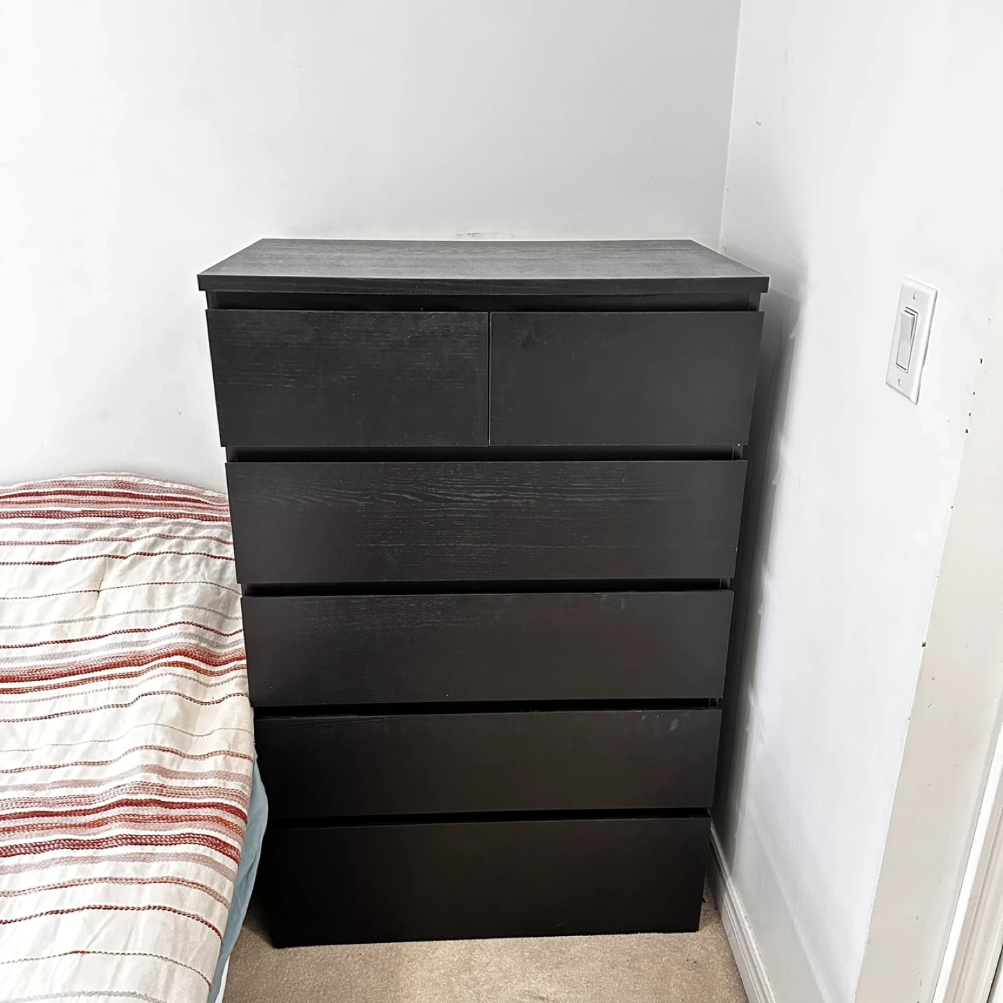This is a black IKEA MALM 6-drawer chest. It has a dark wood finish. The drawers slide smoothly, offering ample storage space. It's a great piece for organizing clothes or other items in your bedroom. It has a slight chip on the back left that’s negligible.