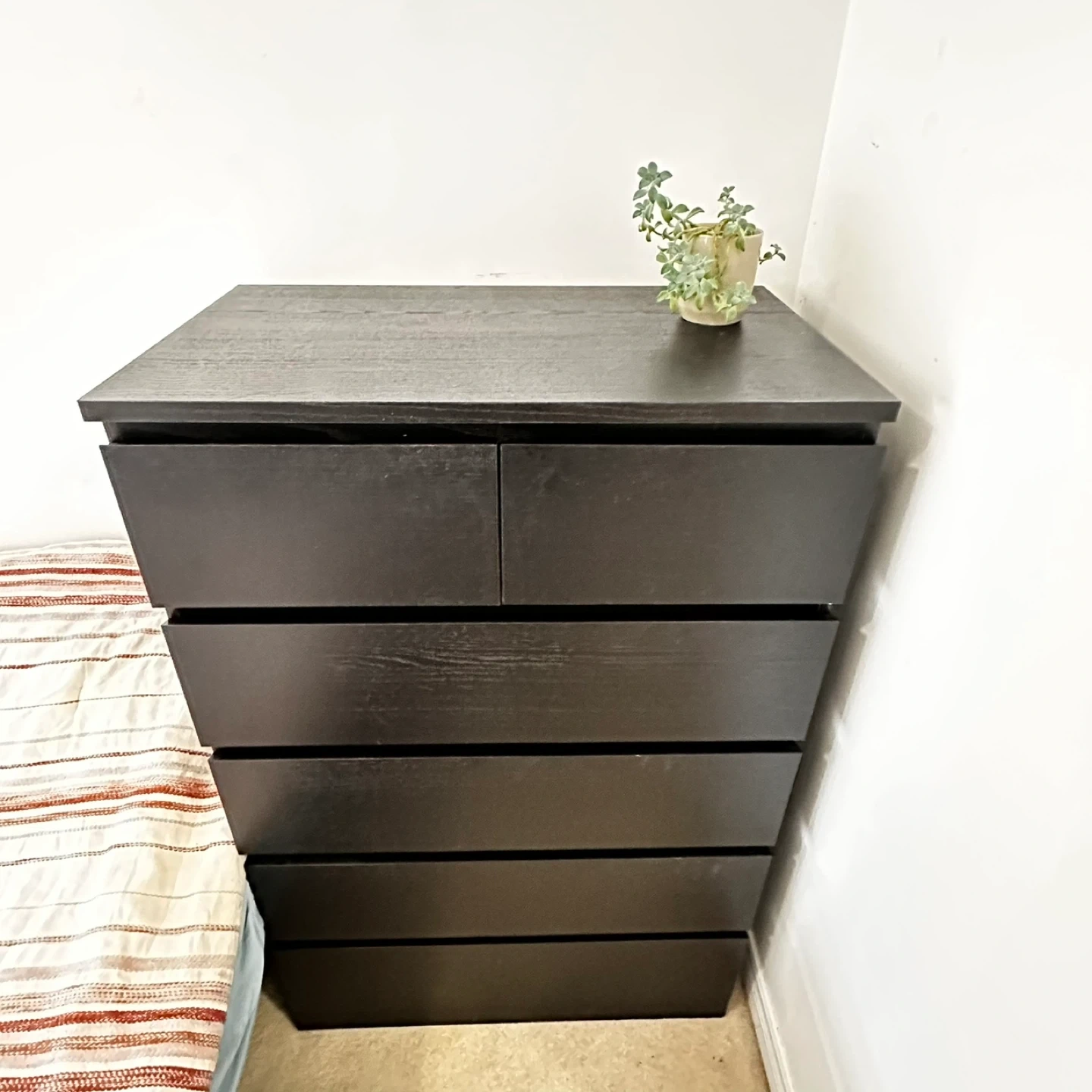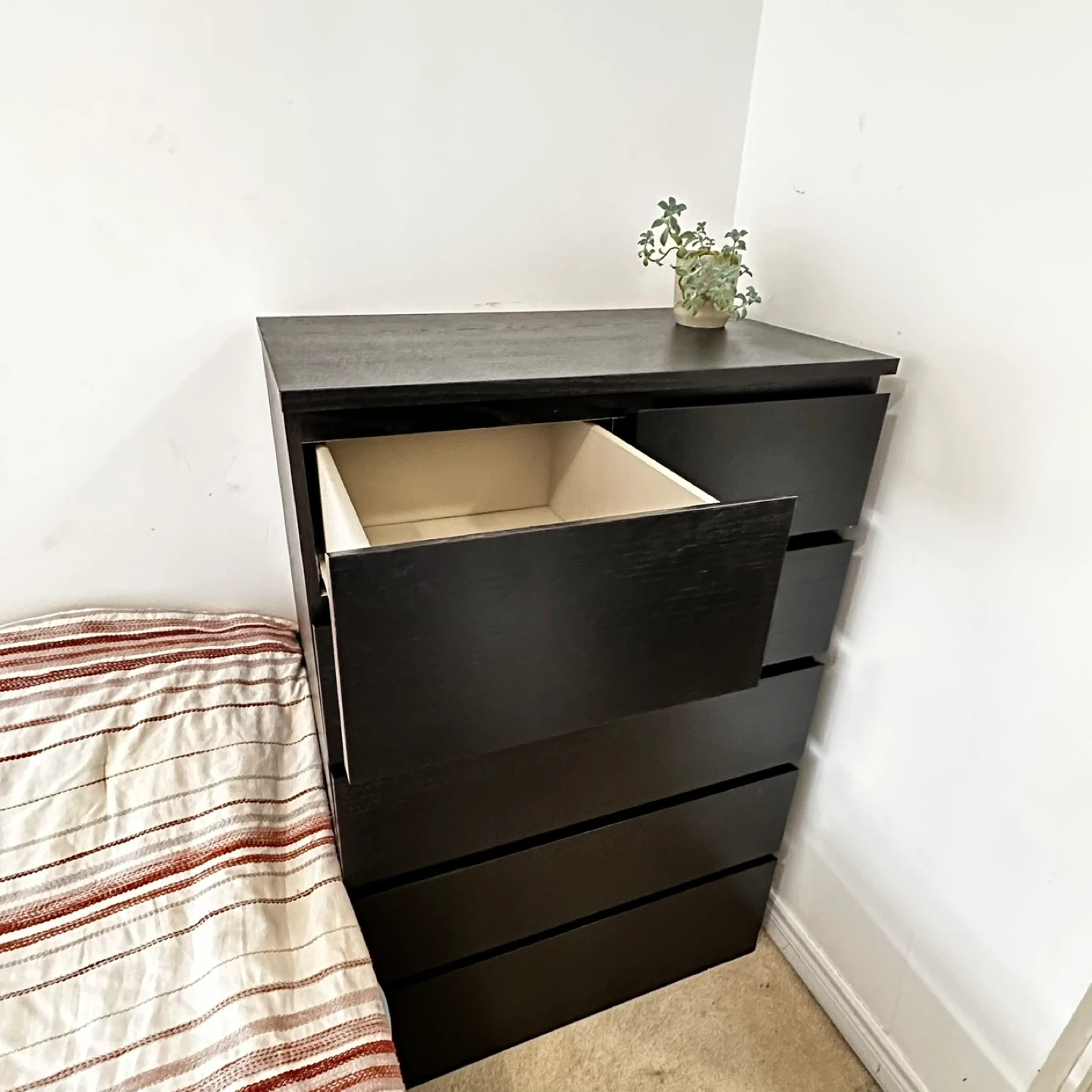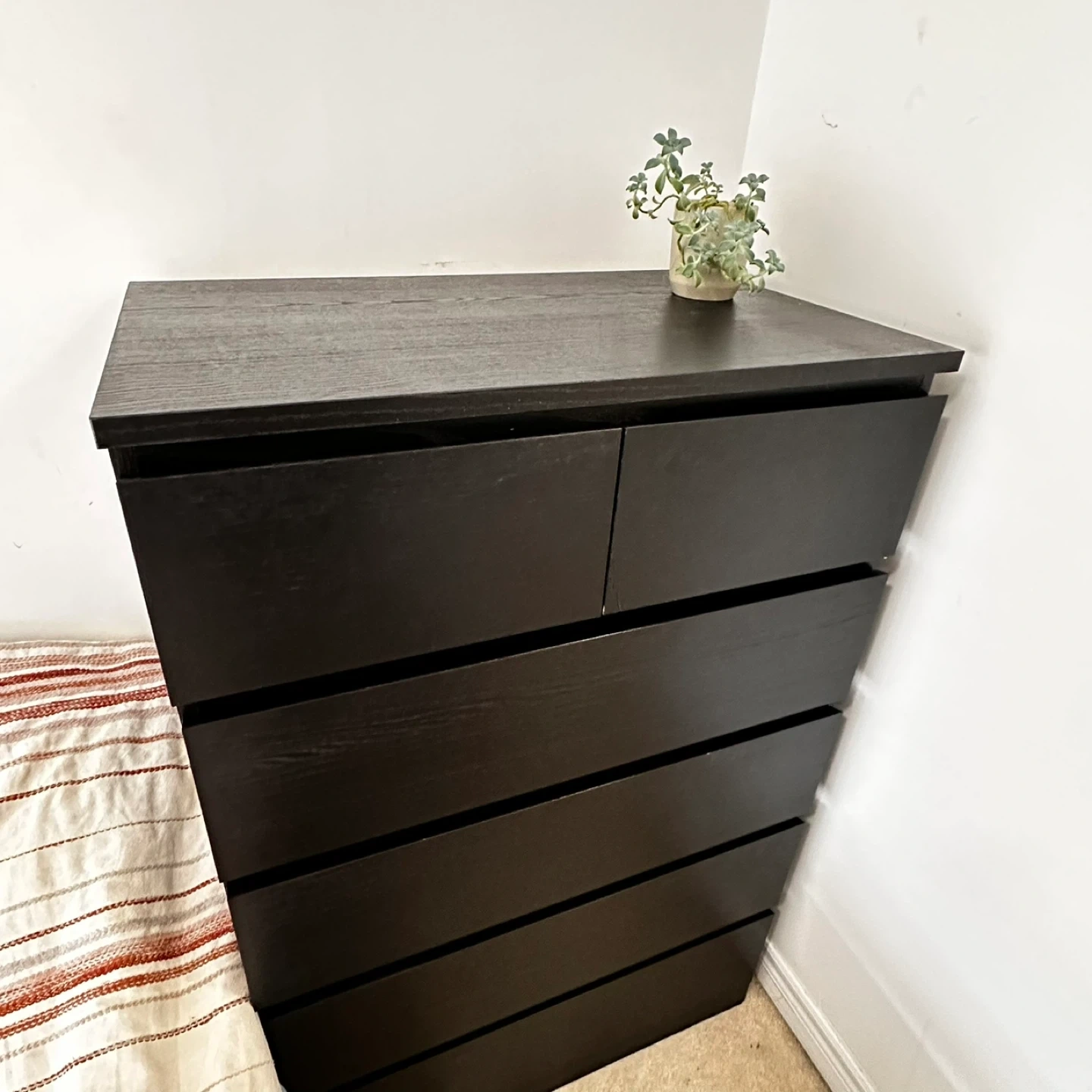 This is a black IKEA MALM 6-drawer chest. It has a dark wood finish. The drawers slide smoothly, offering ample storage space. It's a great piece for organizing clothes or other items in your bedroom. It has a slight chip on the back left that’s negligible.