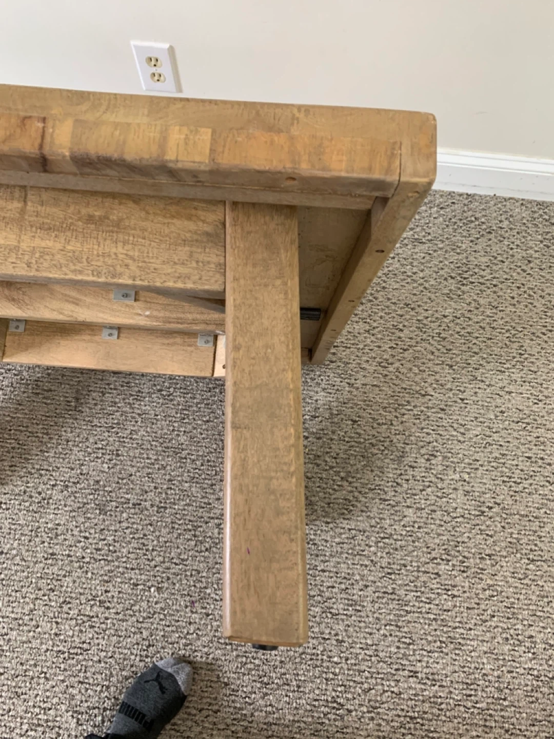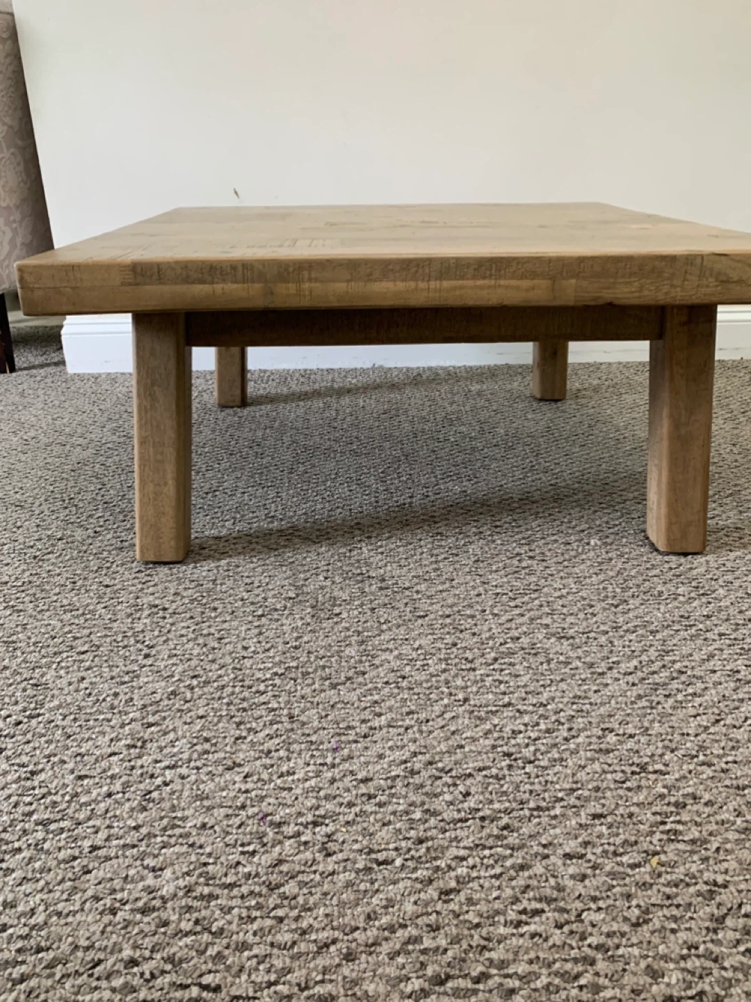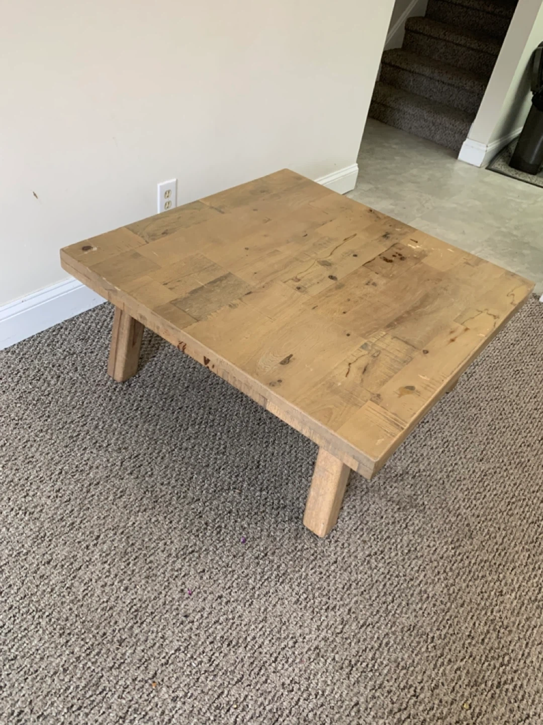Solid wood coffee table with a rustic finish. It's made from reclaimed wood planks. This table would be useful in a living room or den.