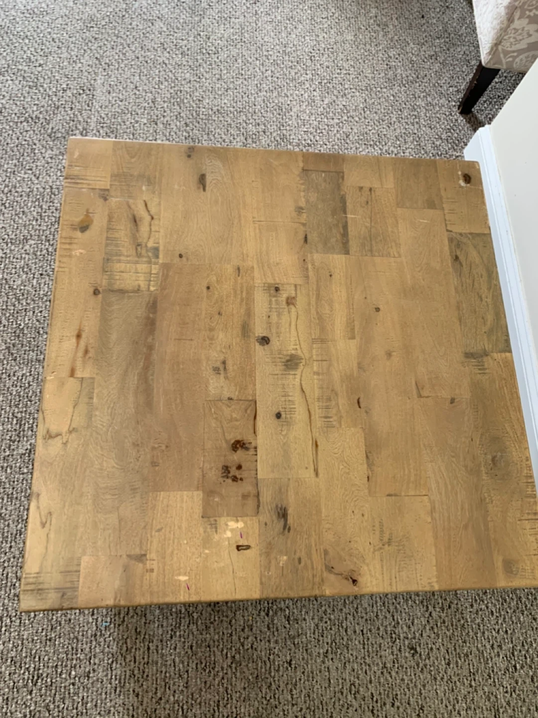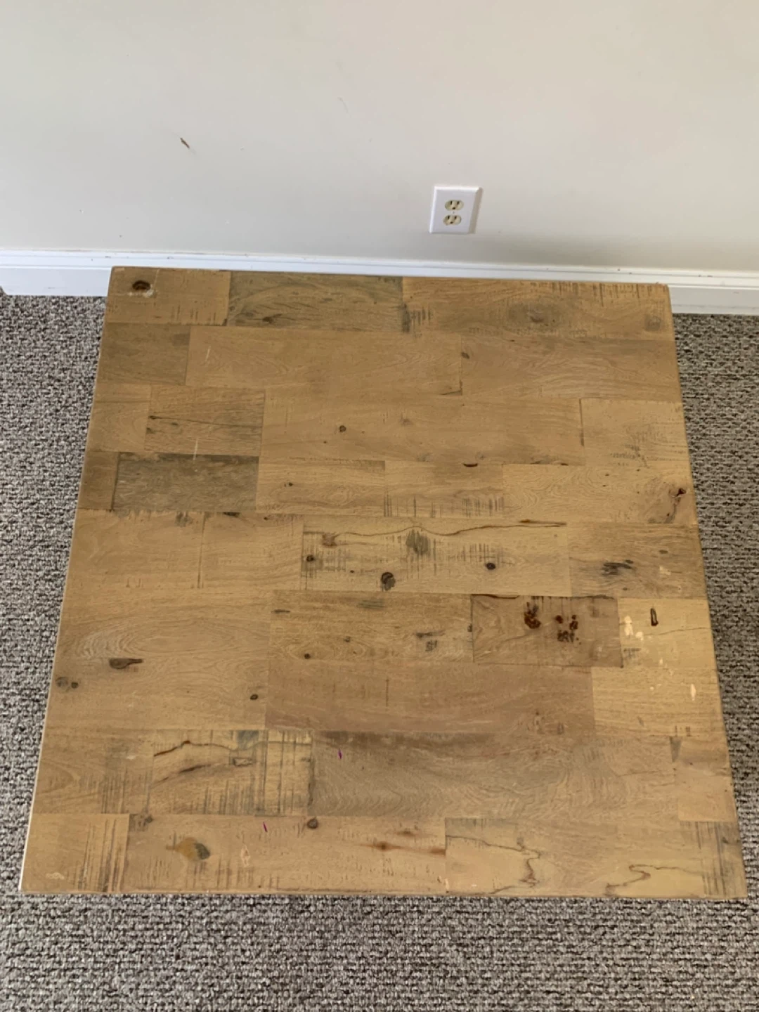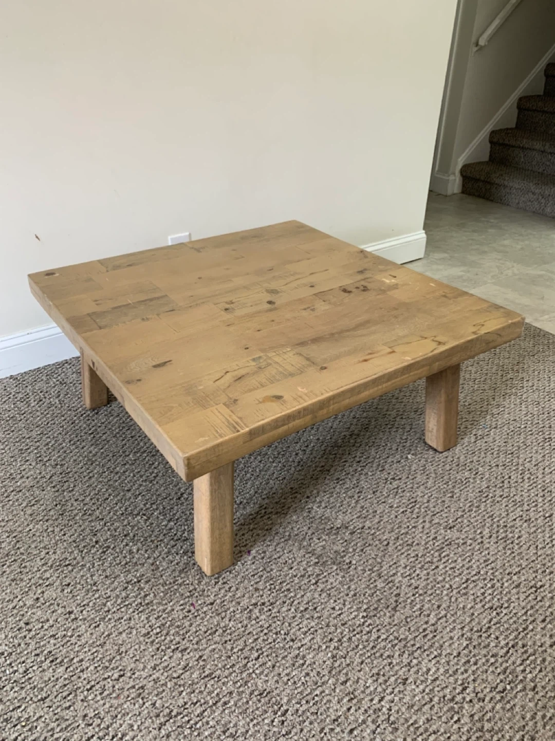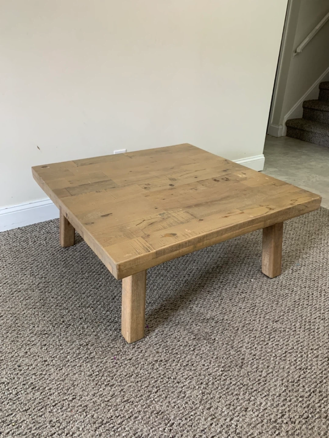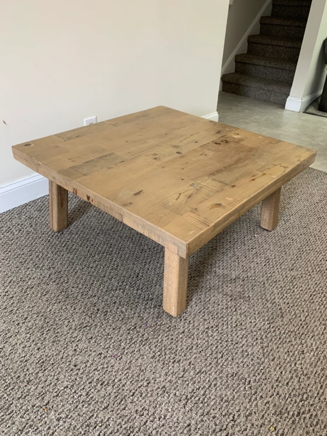 Solid wood coffee table with a rustic finish. It's made from reclaimed wood planks. This table would be useful in a living room or den.