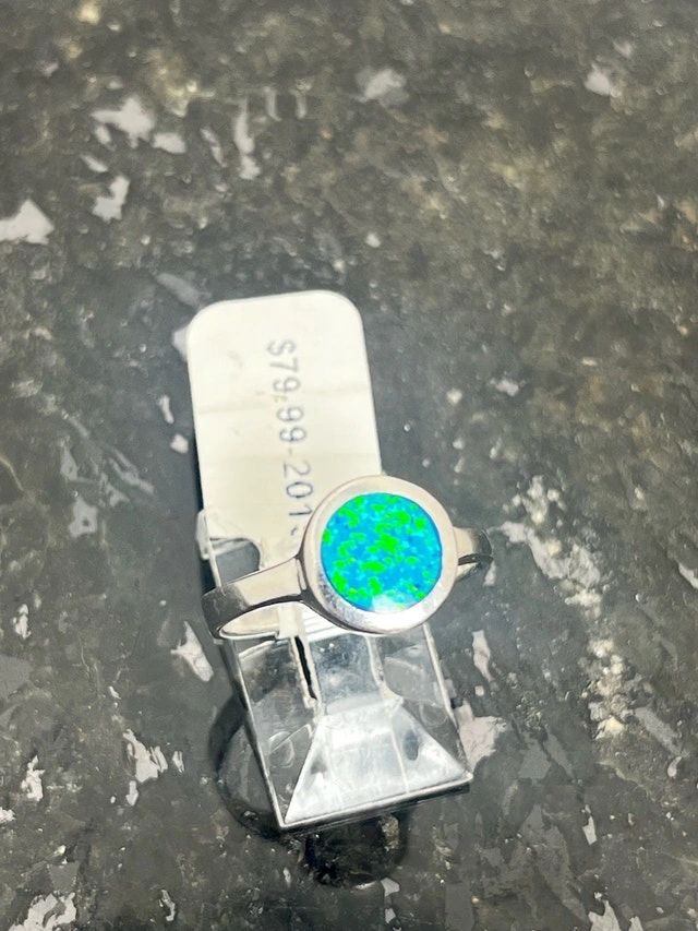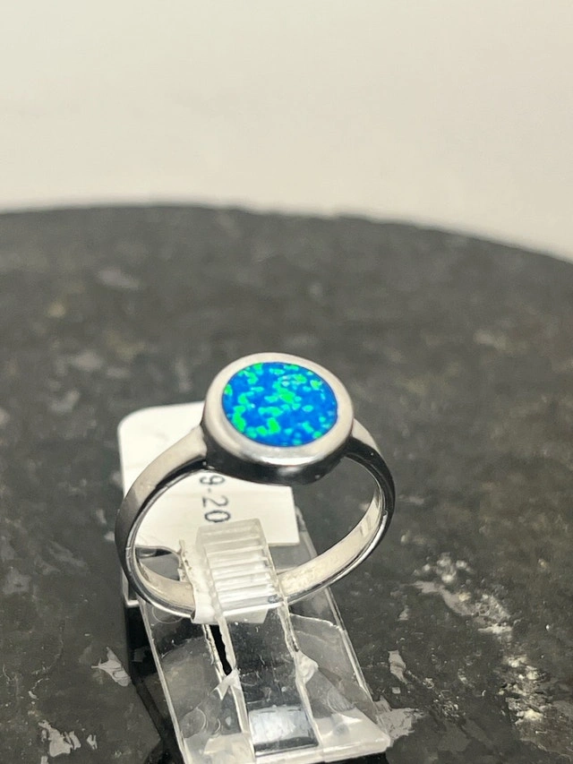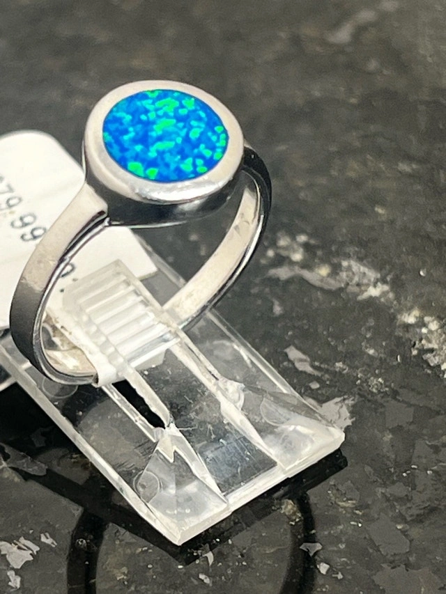 This brand new 925 sterling silver ring features a vibrant, lab-created opal in a size 7, perfect for adding a pop of colour to any outfit. With its classic design and eye-catching stone, this ring is sure to turn heads. Specifications: Metal: 925 Sterling Silver (3G), Stone: Lab-Created Opal, Size: 7, Condition: New. Similar rings sell for around $60, so this is a competitive price. This sparkler is looking for a new home! If the ad's up, the ring's available!