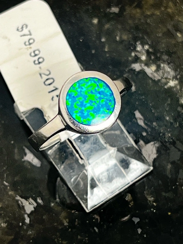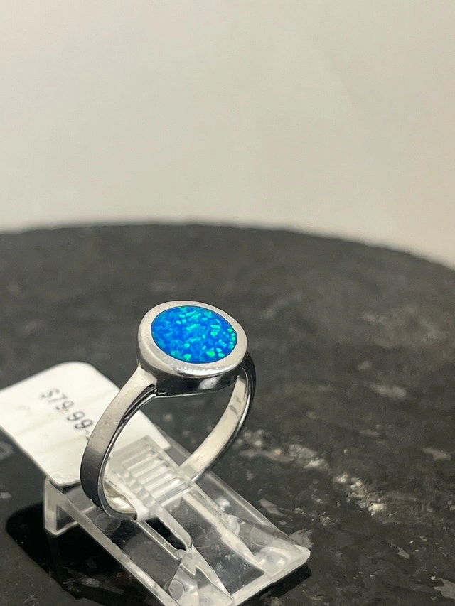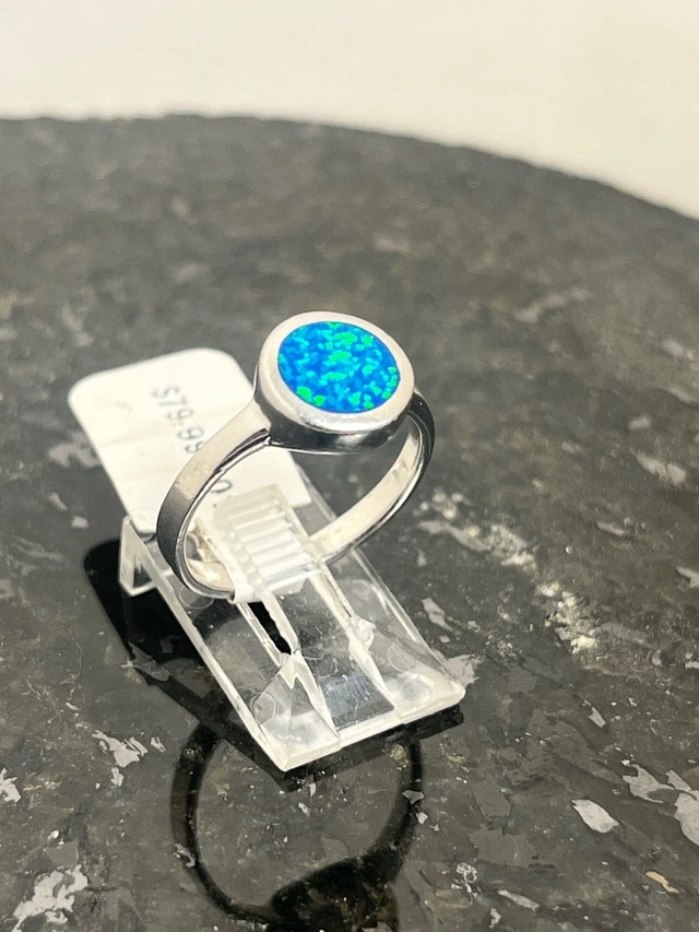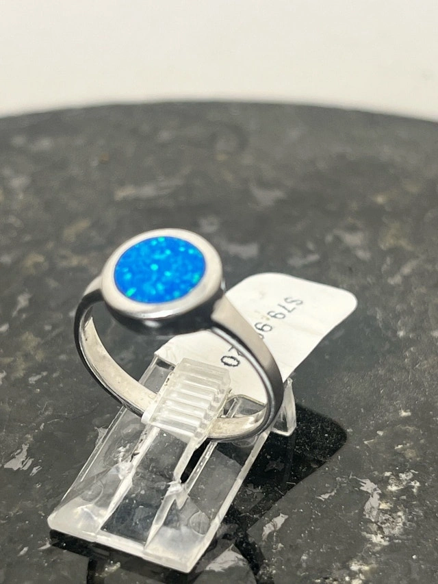 This brand new 925 sterling silver ring features a vibrant, lab-created opal in a size 7, perfect for adding a pop of colour to any outfit. With its classic design and eye-catching stone, this ring is sure to turn heads. Specifications: Metal: 925 Sterling Silver (3G), Stone: Lab-Created Opal, Size: 7, Condition: New. Similar rings sell for around $60, so this is a competitive price. This sparkler is looking for a new home! If the ad's up, the ring's available!