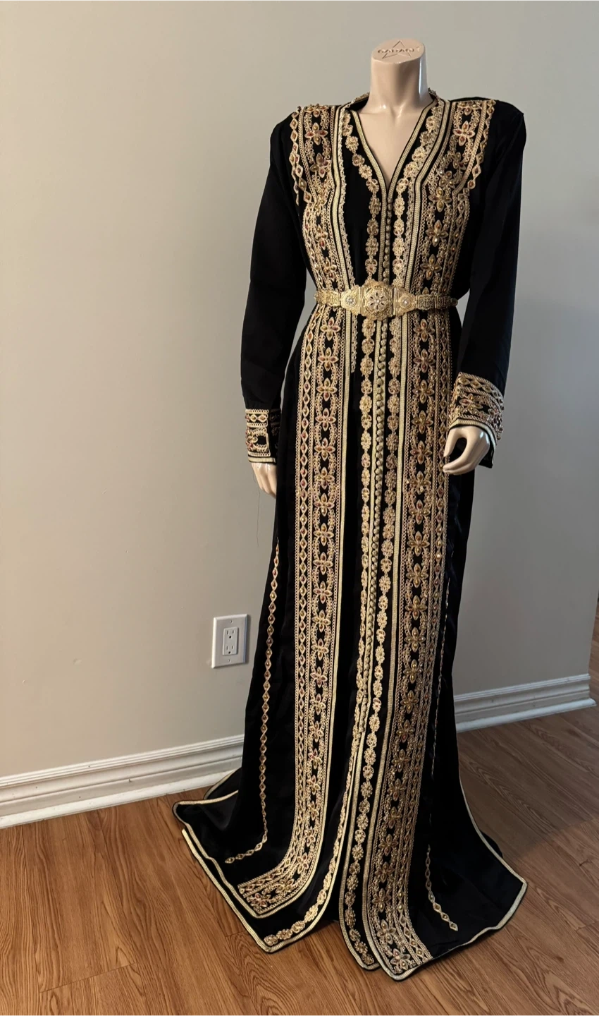 Beautiful black kaftan with intricate gold embroidery! It features a matching belt to cinch the waist. Perfect for special occasions or adding a touch of elegance to your wardrobe