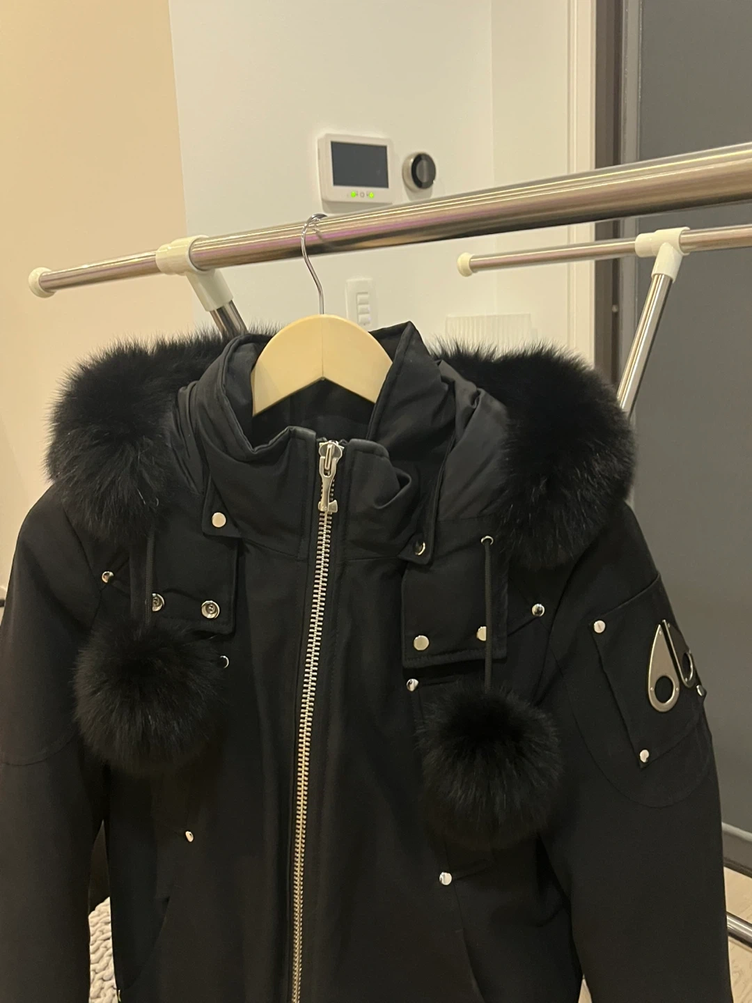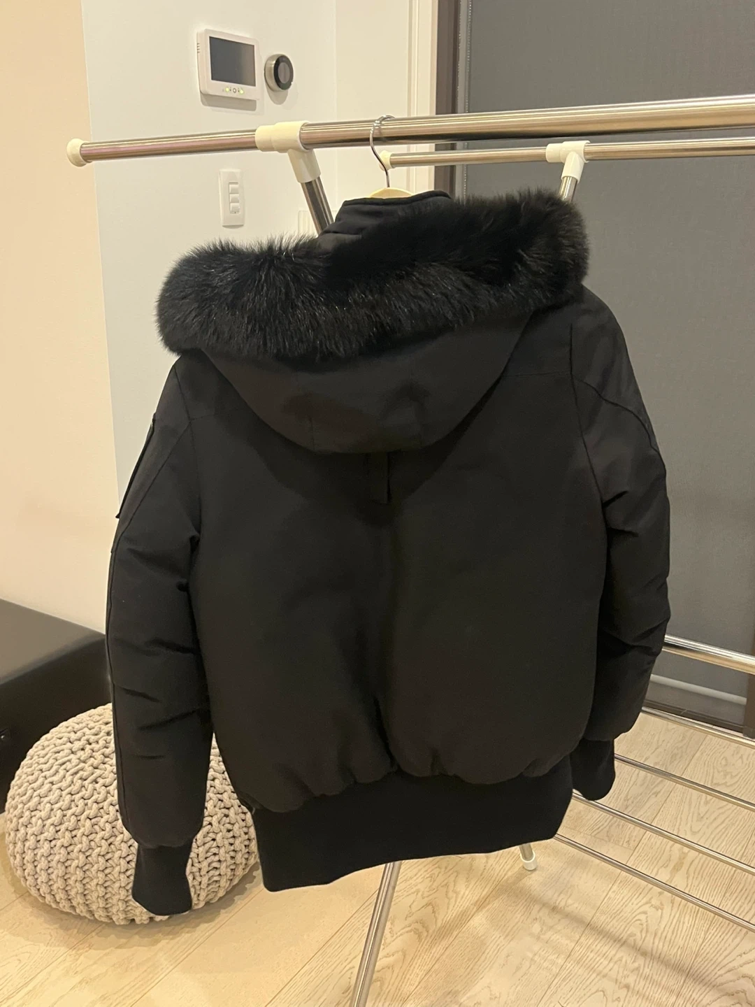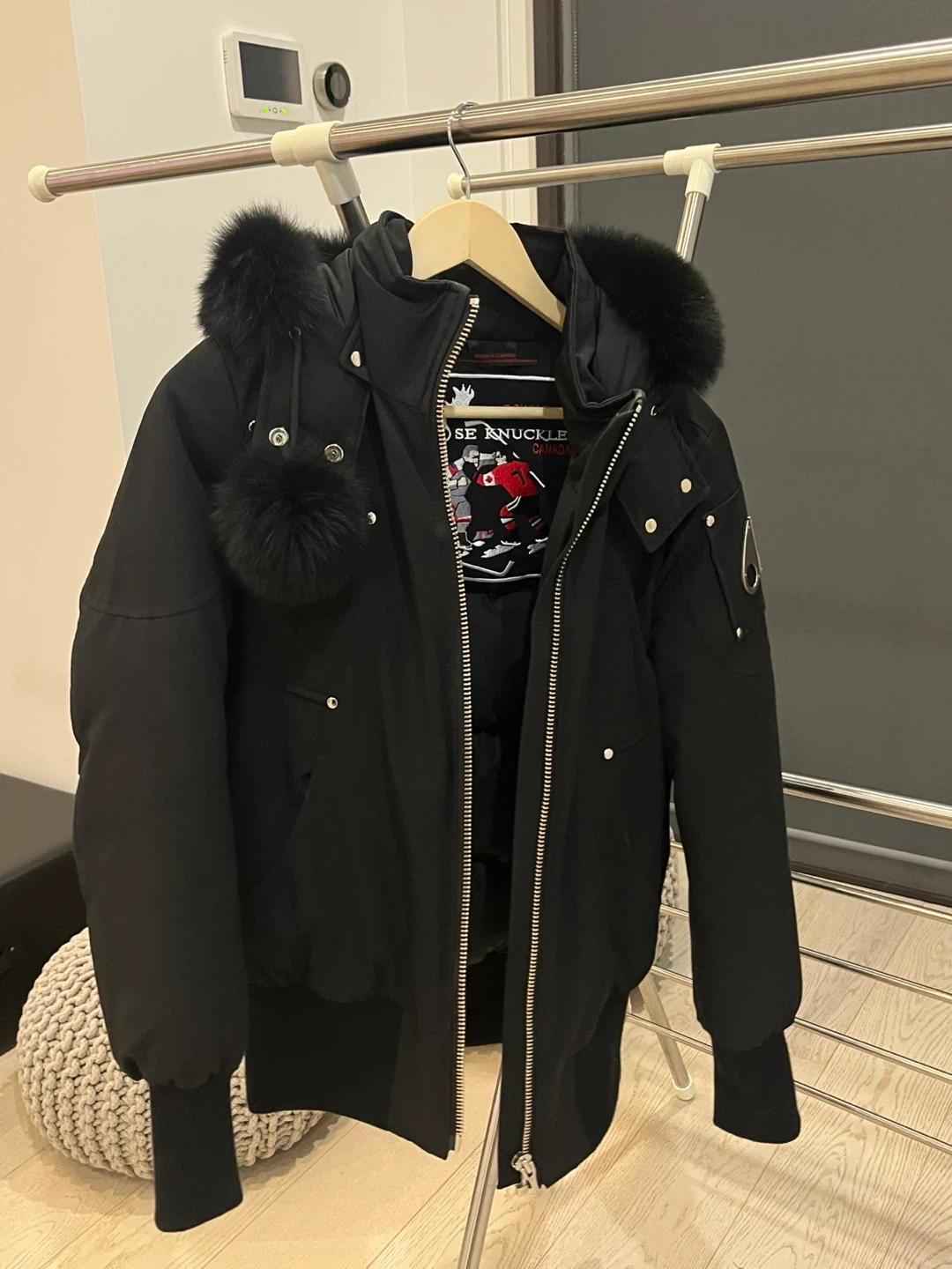 Selling a stylish Moose Knuckles bomber jacket in black. It's in great condition and features a fur-trimmed hood and the iconic Moose Knuckles logo on the sleeve. Perfect for staying warm and fashionable!