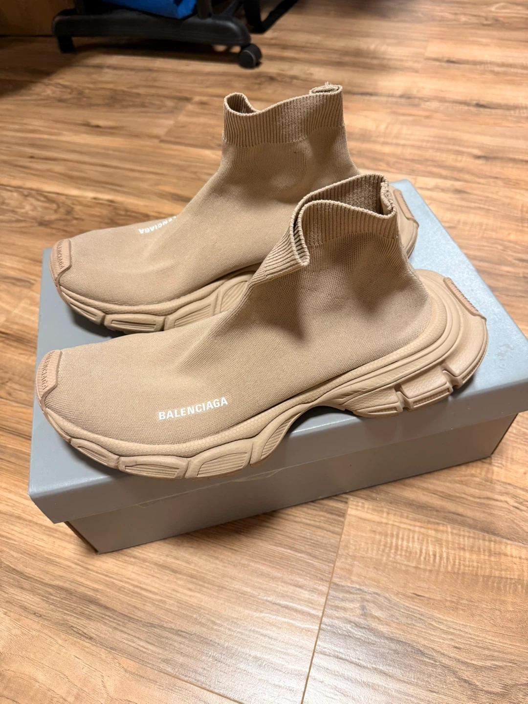 These Balenciaga Speed Trainers are a stylish sock-fit sneaker. They feature a beige knit upper and a contrasting chunky sole. They're made with a flexible material for comfort. Perfect for everyday wear!
