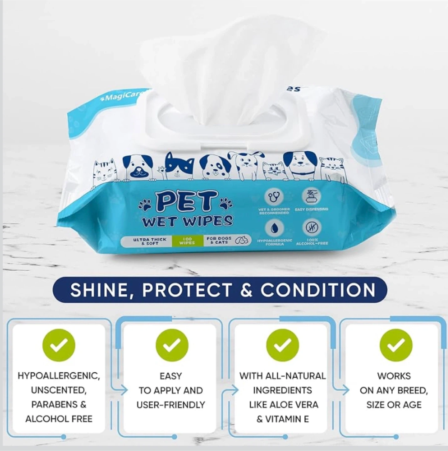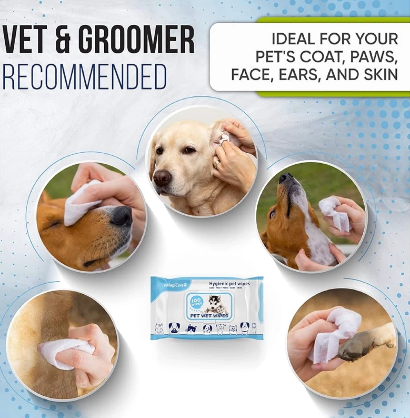 MagiCare Hygienic Pet Wipes come in a convenient 400-piece pack. They're ultra-thick, soft, and formulated with all-natural ingredients like aloe vera and vitamin E. These hypoallergenic wipes are alcohol-free and suitable for dogs and cats.