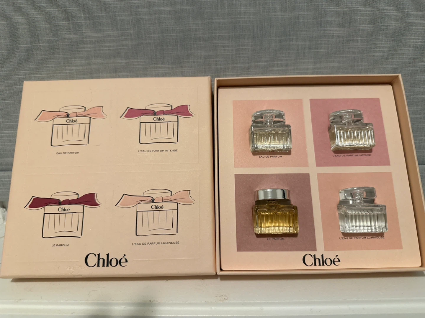 This Chloé gift set includes four miniature perfumes: Eau de Parfum, L'Eau de Parfum Intense, Le Parfum, and L'Eau de Parfum Lumineuse. Perfect for trying out different scents or for travel!