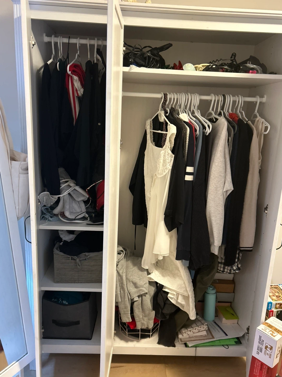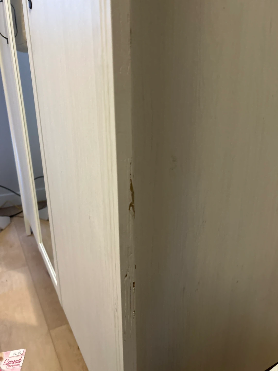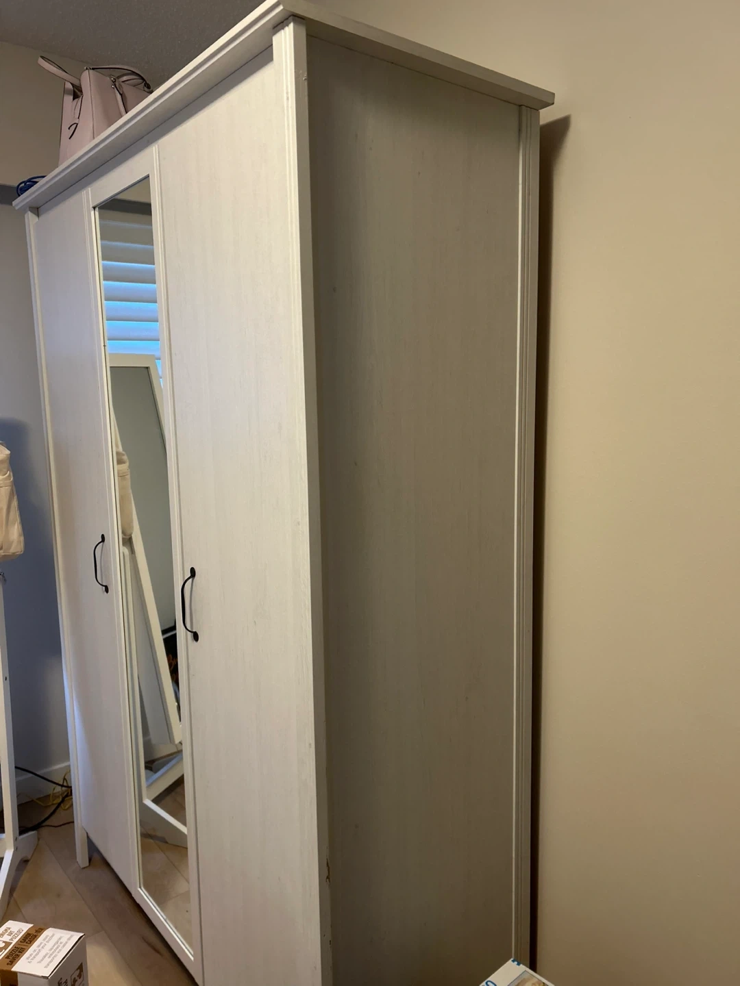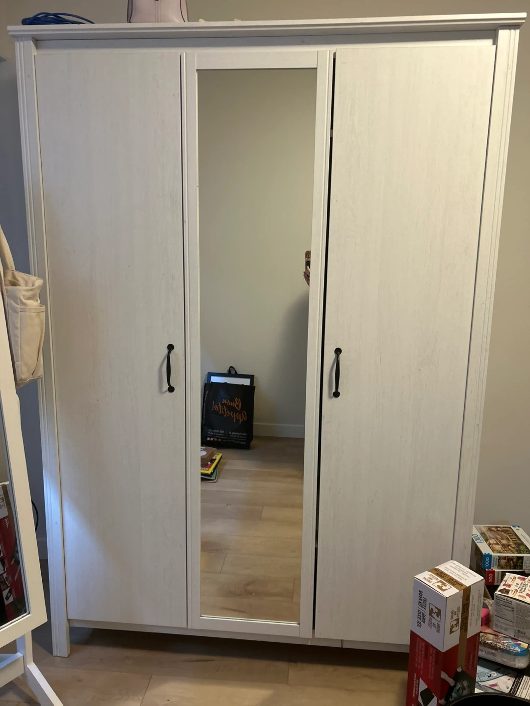 Selling a super beautiful, spacious three-door wardrobe with a centre mirror. It features hanging space and shelves inside. Some minor scuffs on the side. I love it so much but I’m moving again so we’re selling :(