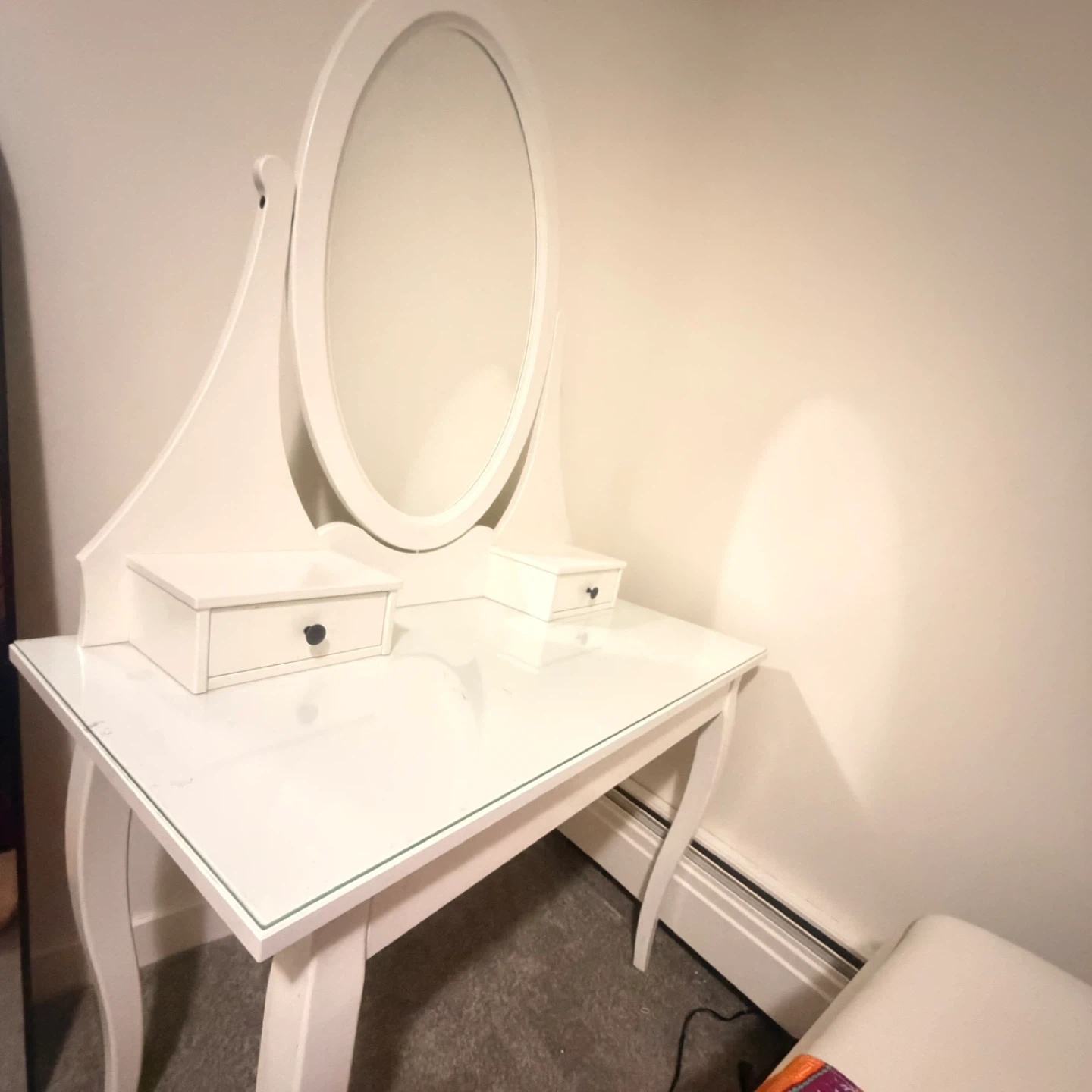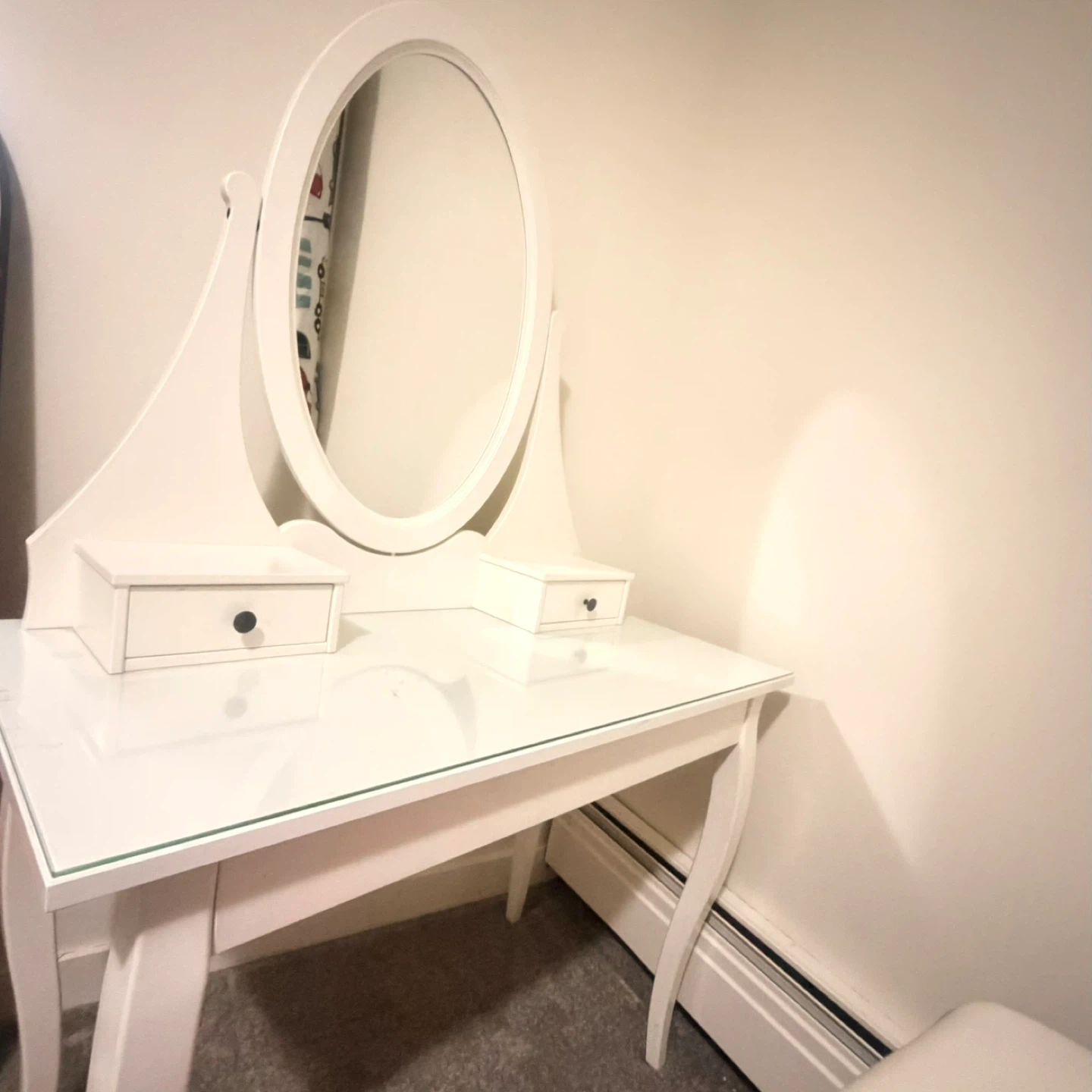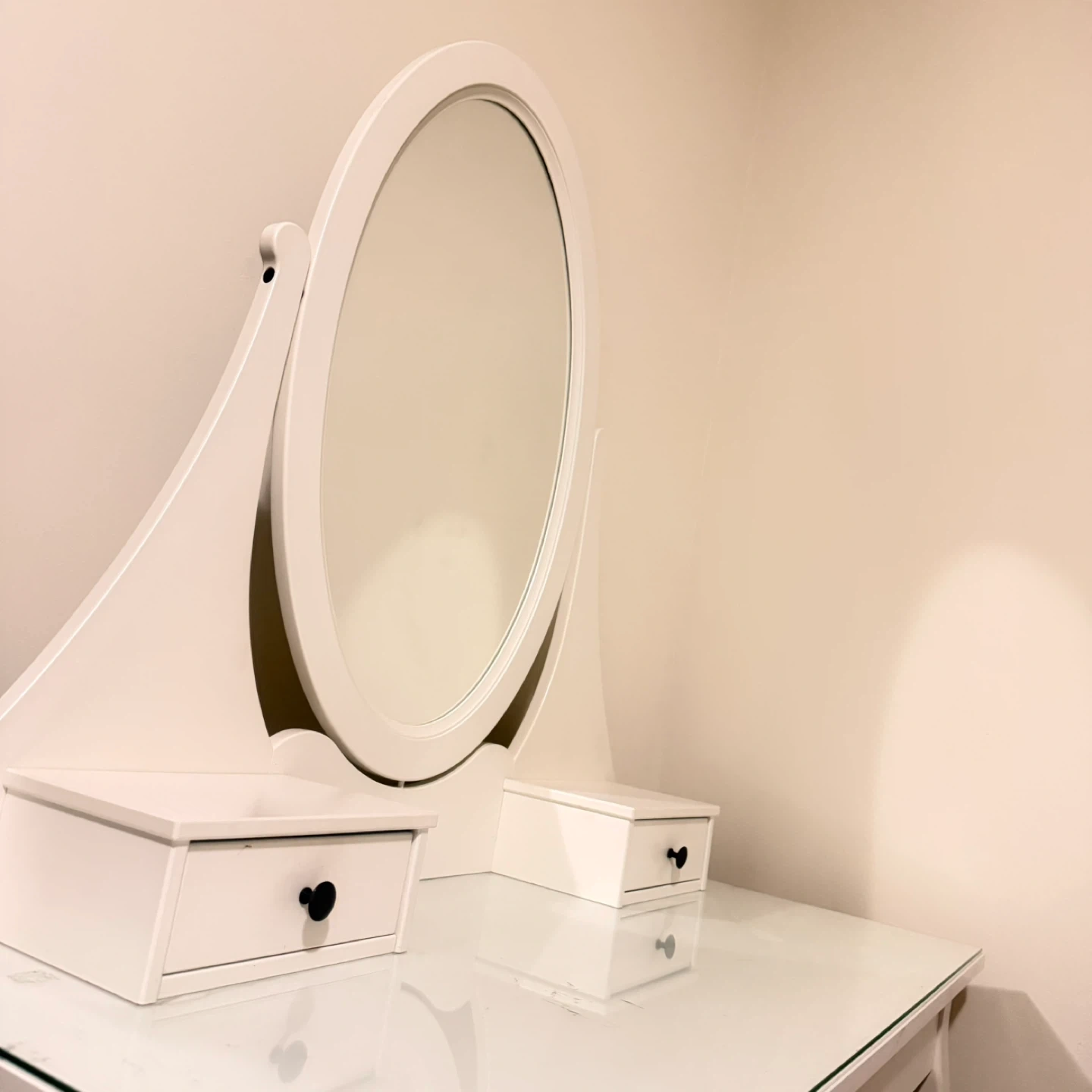 White vanity table featuring an oval mirror and two small drawers for storage. It has a smooth, glossy white finish. The table includes a glass top overlay. Perfect for a bedroom or dressing area!