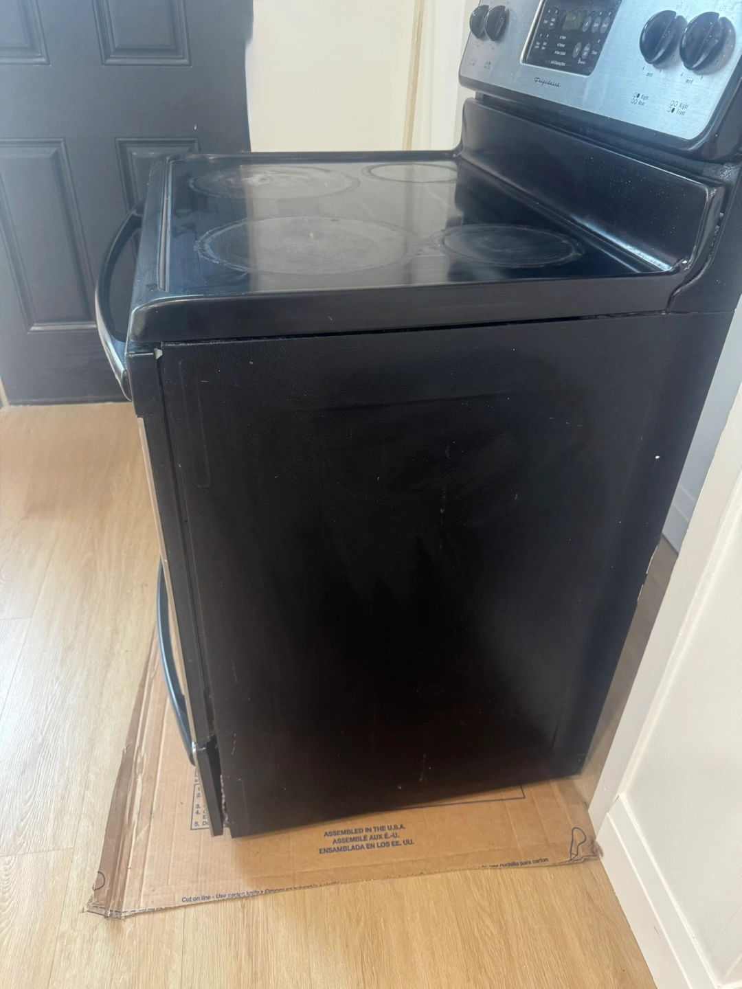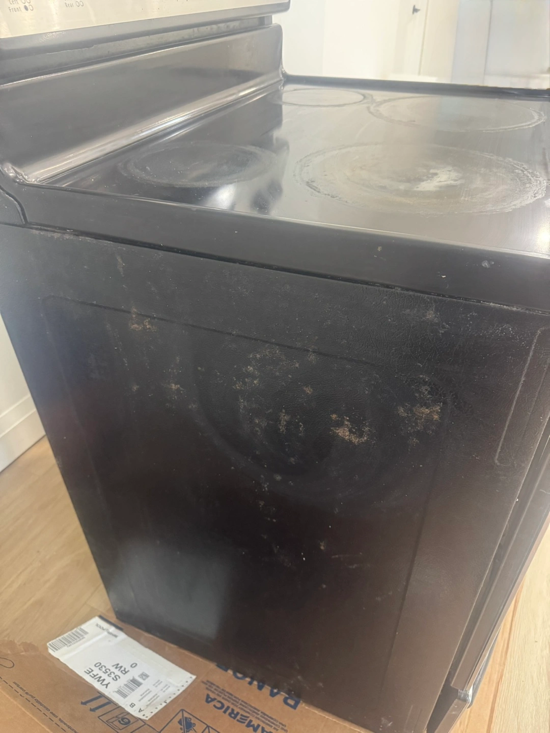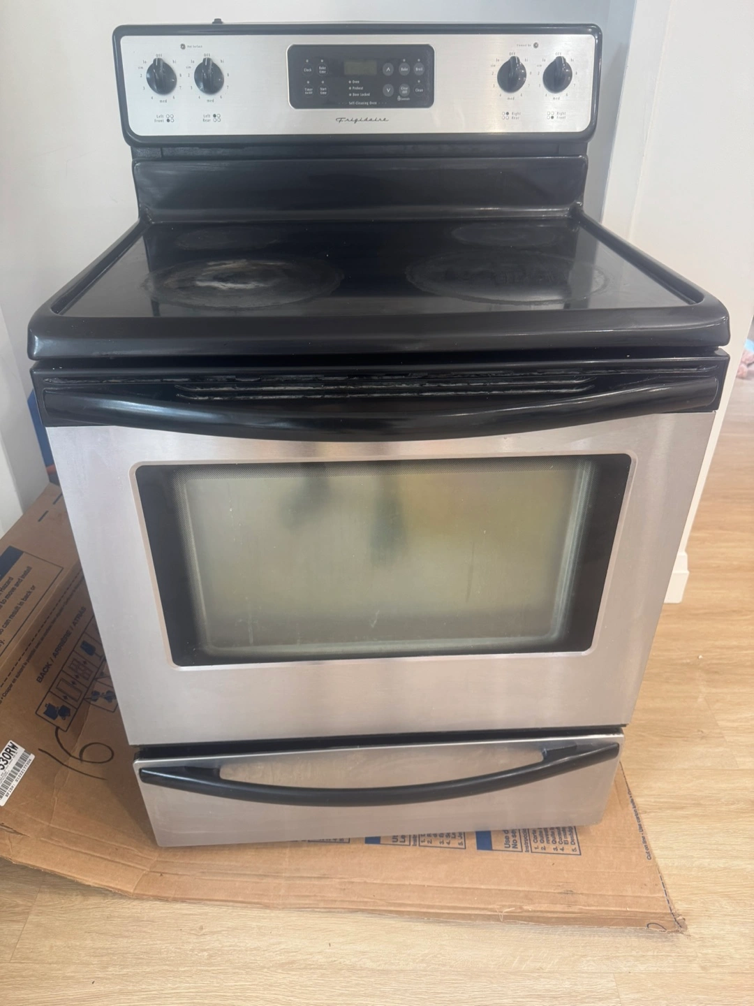 Used electric range, four burners, self-cleaning oven. Stainless steel front and sides. Black top. Some minor cosmetic imperfections.